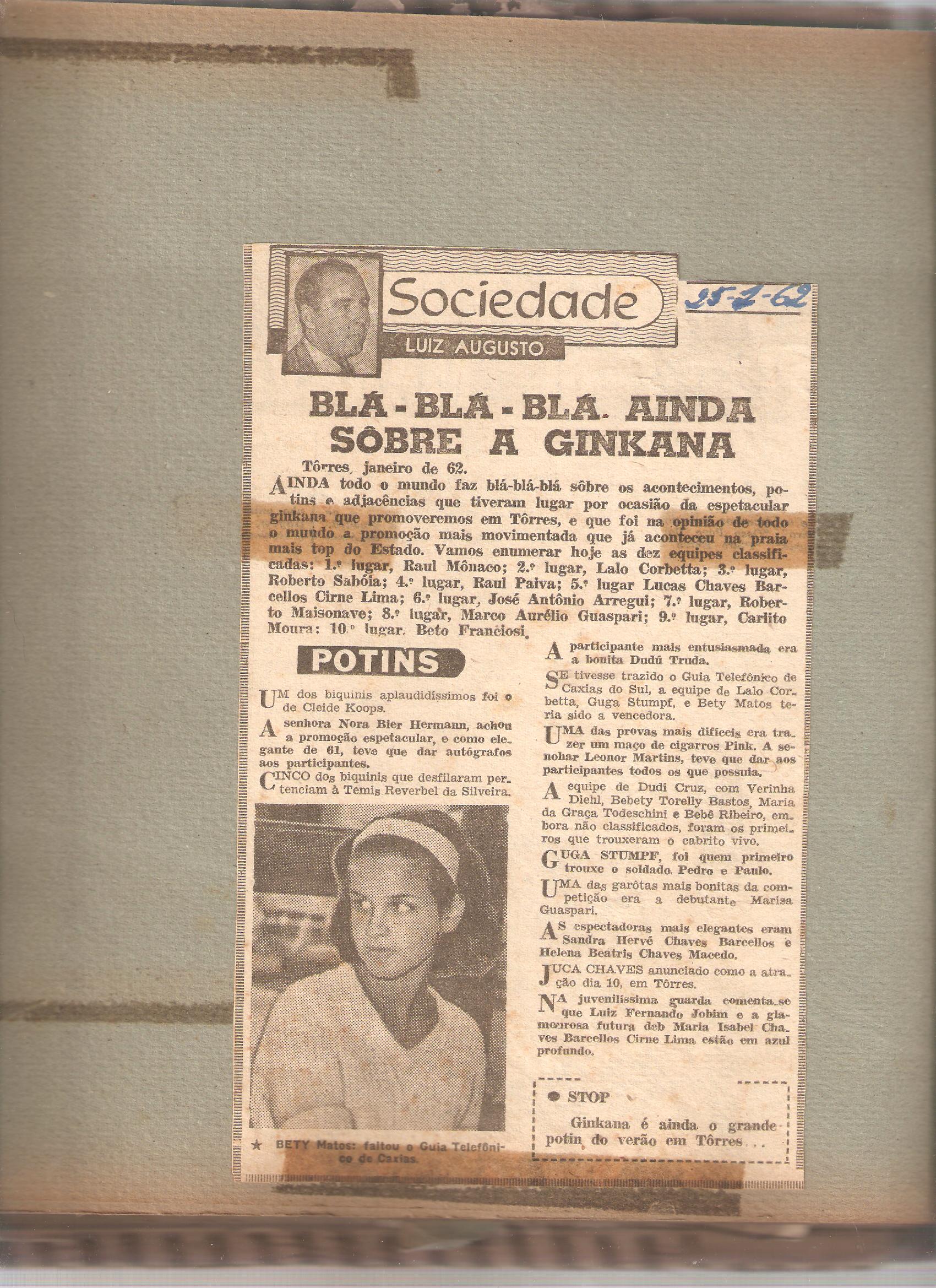 “Os nomes mais top da jovem guarda gaúcha tomaram parte ativa na competição. O segundo lugar coube à equipe de Lalo Kroeff Corbeta com Guga Stumpf, Beth Mattos e Anette Ferreira. E o terceiro lugar à equipe de Roberto Saboia, com Kitty Kroeff, Oswaldo Kroeff e Vinicius Shimitd.