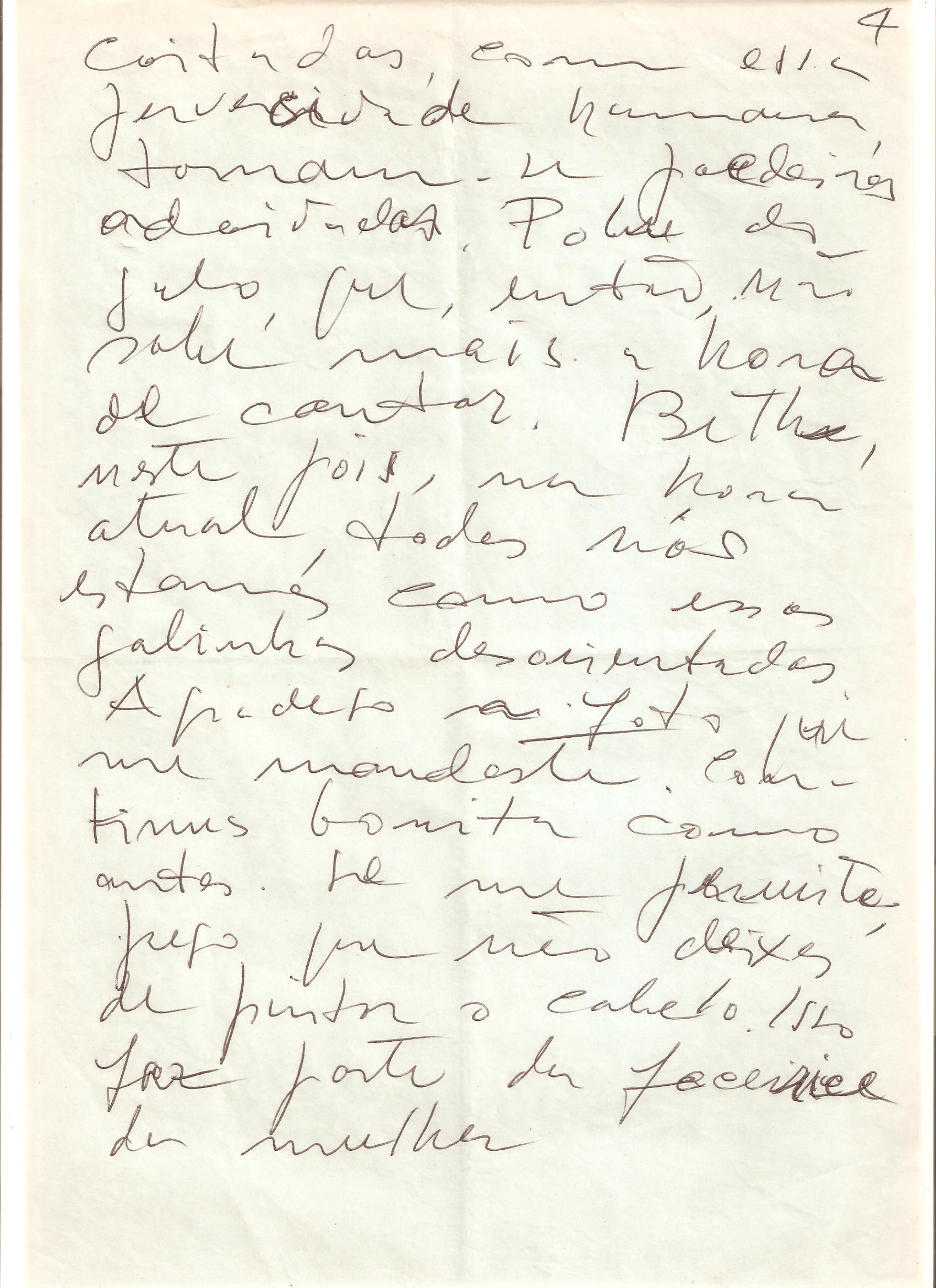 Porto, Alegre, 27 – 8 – 87. Beth, querida amiga. No momento, infelizmente, não temos condições de aceitar o teu amável convite. Maria acaba de ser operada de catarata. Ela deve permanecer por algumtempo no mais absoluto repouso. Estou otimista, acho que desta vez a cirurgia vai dar certo, o que não aconteceu quando operou a outra vista. O livro que pretendo fazer – 10 contos ilustrados com serigrafias – quero que seja umo bjeto bonito, como todos os livros deveriam ser. Este livro que vai ser patrocinado por uma agência de publicidade lá de Vitória terá uma edição limitada, talvez até numerada, não sei. Tu, evidentemente, vais ter um exemplar. Beth: sinto o teu isolamento, a tua solidão, e a falta que faz a tua mãe. Quem sobrevive aos seus carrega sombras e saudade. Coragem Beth é a lei da vida. Nós também estamos construindo uma casa em Nonoai (Teresópolis). Trata-se de uma casa espaçosa, com dois atelieres anexos, um de pintura, outro de gravura. Essa chuva que não para, tem atrasado a obra, cujo acabamento está previsto para o fim do ano. É um tanto louco fazer uma casa nesta altura da vida. Sim, é louco, mas é uma afirmação de vida. Concordas? Beth, abraços e muito carinho. O Iberê