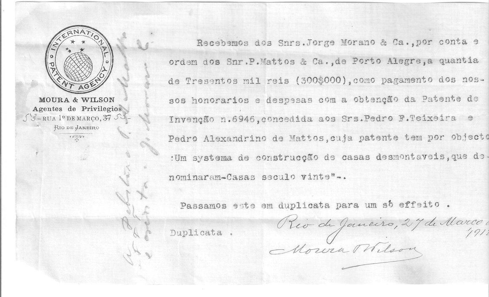 (…) pagamento dos nossos honorários e despesas com a obtenção da PATENTE De INVENÇÃO n.6946, concedida aos Senhores Pedro F. Teixeira e Pedro Alexandrino de Mattos, cuja patente tem por objecto: Um systema de construccção de casas desmontáveis, que denominaram – “Casas século vinte” –
