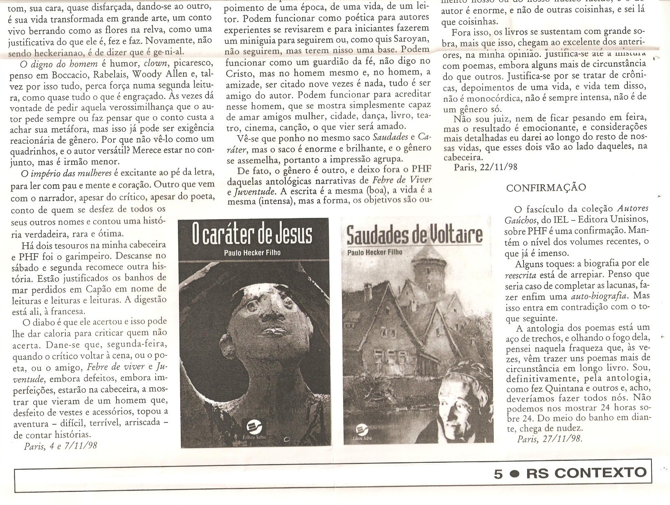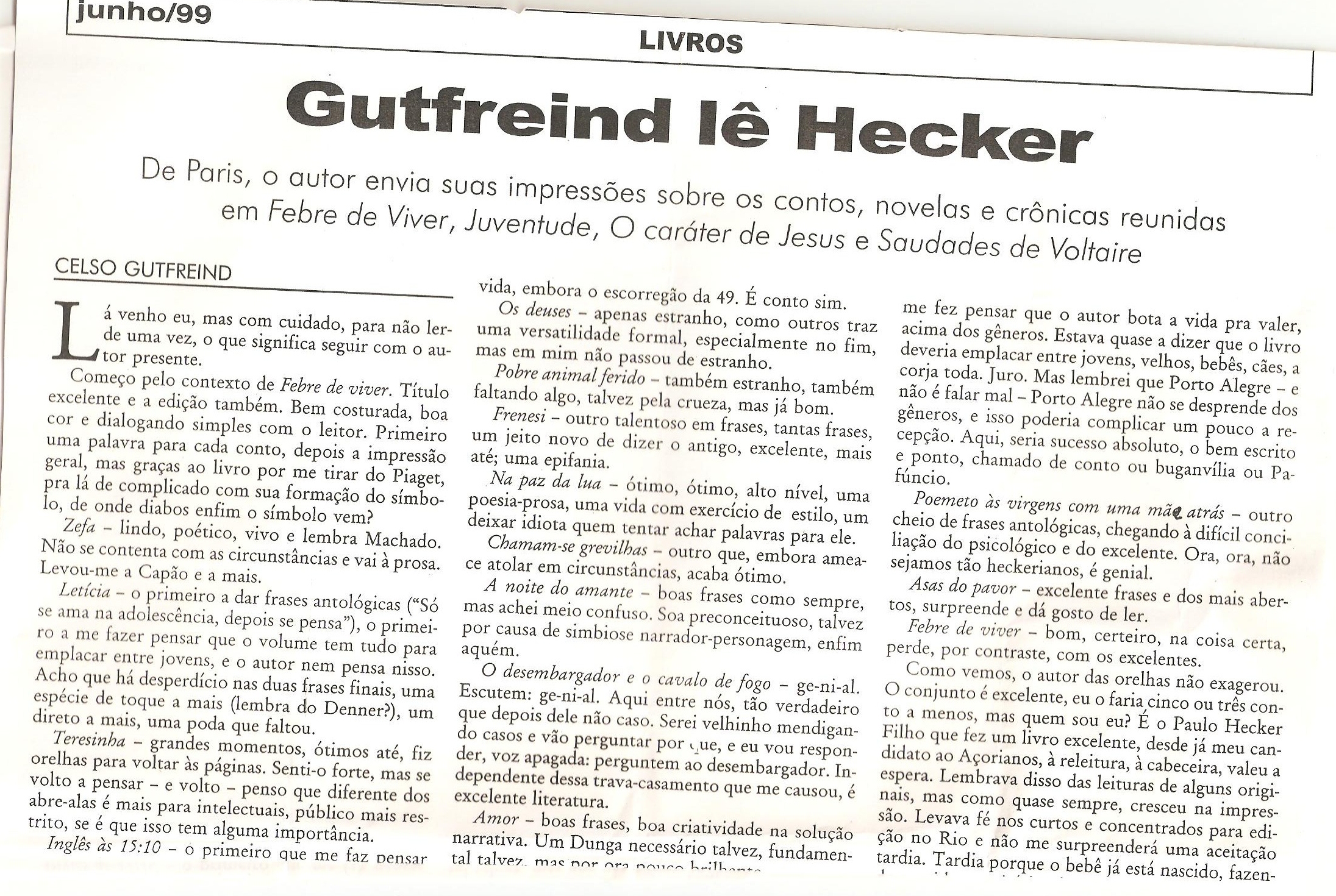 “O diabo é que ele acertou e isso pode lhe dar caloria para criticar quem não acerta. “Dane-se que, segunda-feira, quando o crítico voltar à cena, ou o poeta, ou o amigo, Febre de Viver e Juventude, embora defeitos, embora imperfeições, estarão na cabeceira, a mostrar que vieram de um homem que, desfeito de vestes e acessórios, topou a aventura – difícil, terrível, arriscada – de contar histórias. Paris, 4 e 7 de novembro de 1998.”