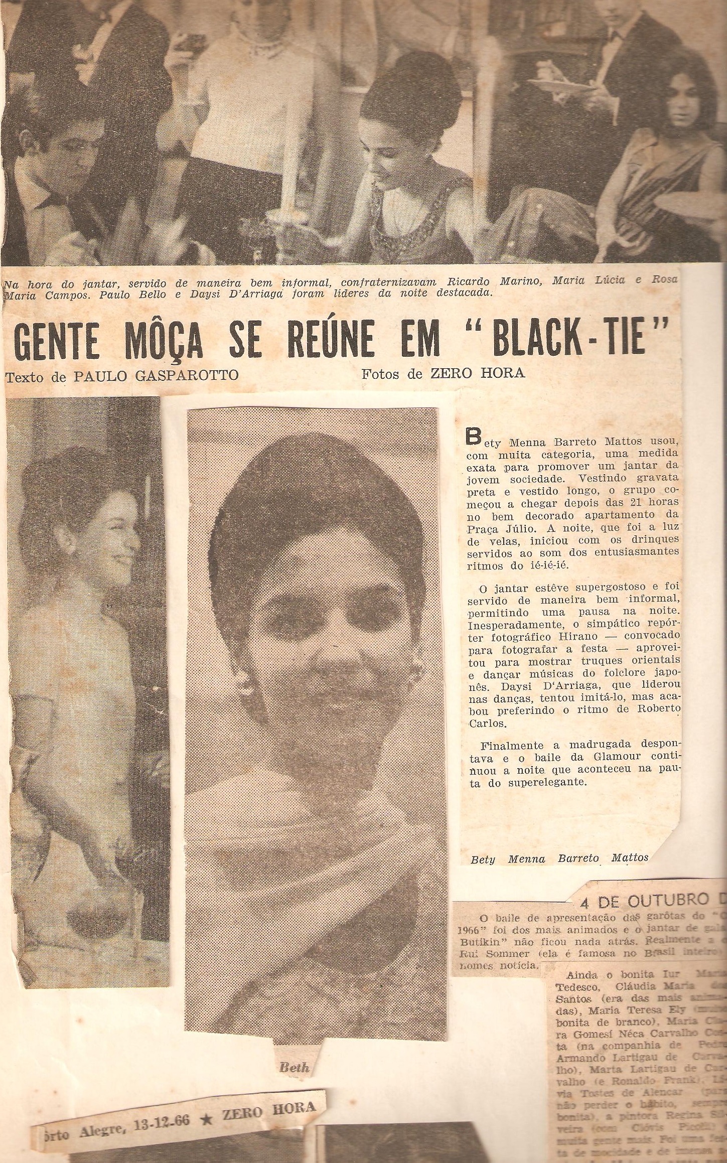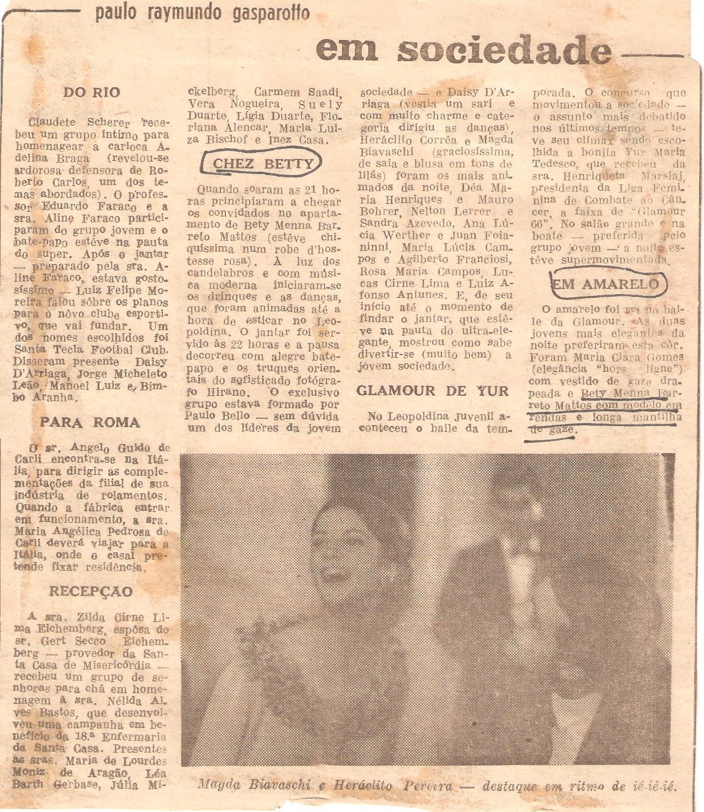 “Magda Biavaschi e Heráclito Pereira – destaque em ritmo de ié-ié-ié. O exclusivo grupo estava formado por Paulo Bello – sem dúvida um dos lideres da jovem sociedade. – e Daisy D’ Arriaga (vestia um sari e com muito charme e categoria dirigiu as danças. Heráclito Corrêa e Magda Biavaschi (graciosíssima, de saia e blusa em tons lilás) foram os mais animados da noite, Déa Maria Henriques e Mauro de Athayde Bohrer, Nilton Lerrer e Sandra Azevedo, Ana Lúcia Werther e Juan Foianinni, Maria Lucia Campos e Agilberto Franciosi, Rosa Maria Campos, Lucas Cirne Lima e L. A. Antunes.”