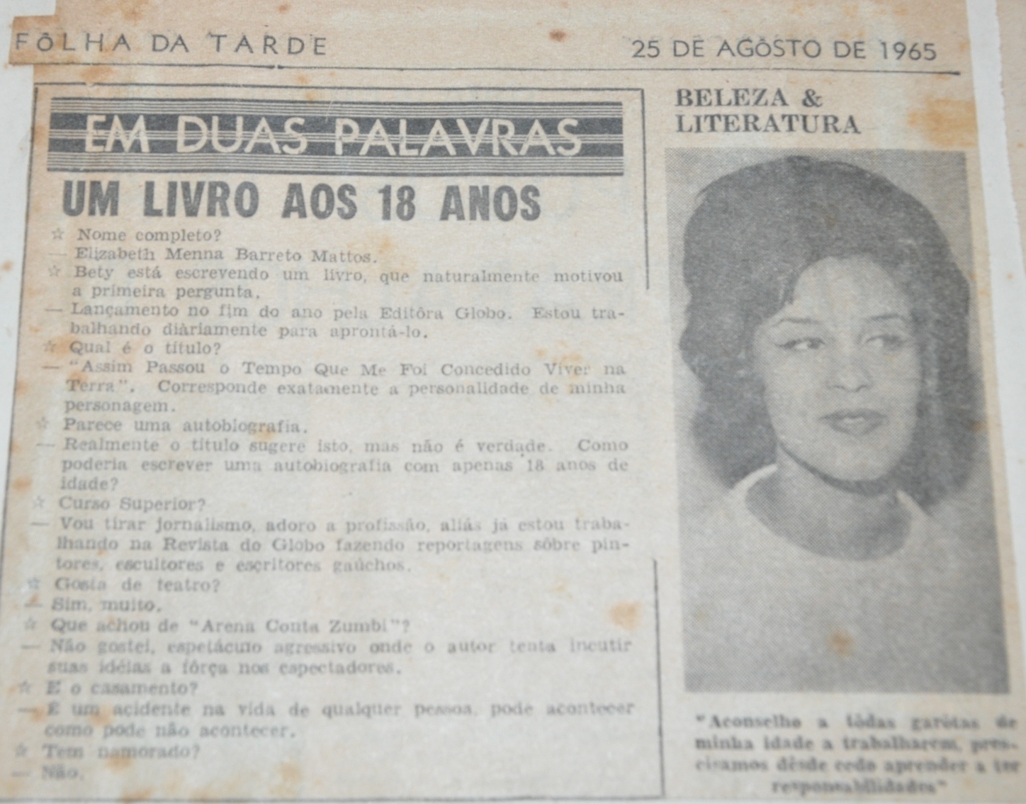 Hoje sempre ontem. Se quiser saber o que aconteceu com Alice, com a Suzana, Sandra, e Roberto, ou com a Joana, Maria Augusta, José, Ricardo, Agnaldo Pacheco, Vladimir, Flávio e Eduardo. Ricardo Vilas. Anita. Francisco. Antônio e Agilberto, nada contundente se revela. É preciso a Comissão da Verdade. Desapareceram sem deixar notícias nos jornais. Ou em mim? O que faz a notícia não diz tudo, ainda. Ernesto Sabato protestou. Agora saberemos como foi a morte de Jango . E como o marido de Dilma, presidenta, foi castigado. Albert Camus morreu num acidente de carro. Walmor se suicidou. João Pedro caiu no mar. Seguimos sem saneamento básico. Ruas esburacadas. Trânsito caótico. O dinheiro roubado não foi devolvido. Ou foi? Mas tudo será dito sobre a tortura. E tudo será feito pelo miserável, não haverá pobreza extrema. Tranquilizo. E, meninas dançam, namoram. Usam bonde tanto quanto automóveis. O bonde de Santa Tereza enfeita o Rio de Janeiro. Longa tarde de risada e sonho. Vou para Portugal! Juízas. Advogadas, mães, promotoras. Resoluções. Importa é estudar. Ou no ócio, o prazer… Pedregulho. Caminho estreito. Digitalizado. Simples. A notícia de ontem ainda se faz hoje. Amadora sou eu a reler, e reescrever. Já passou… Tudo estórias.