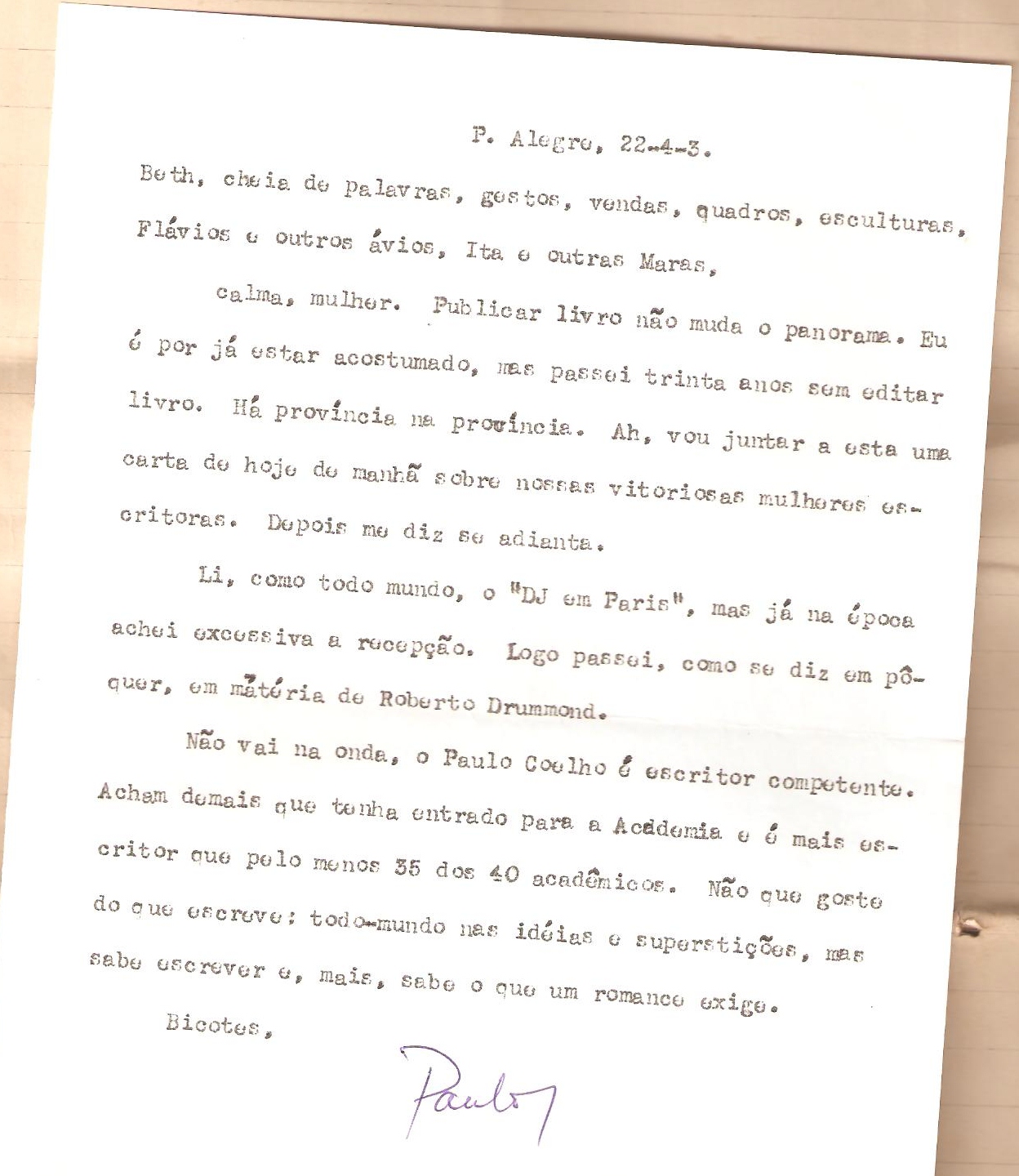 Beth, cheia de palavras, gestos, vendas, quadros, esculturas, Flávios e outros ários, Ita e outras Maras, calma, mulher. Publicar livro não muda o panorama. Eu é por já estar acostumado, mas passei trinta anos sem editar livro. Há província na província. Ah, vou juntar a esta carta uma carta de hoje de manhã sobre nossas vitoriosas mulheres escritoras. Depois me diz se adianta. Li, como todo mundo, o ‘DJ em Paris’, mas já na época achei excessiva a recepção. Logo passei, como se diz em pôquer, em matéria de Roberto Drummond. Não vai na onda, o Paulo Coelho é escritor competente. Acham demais que tenha entrado para a Academia e é mais escritor que pelo menos 35 dos 40 acadêmicos. Não que goste do que escreve: todo-mundo nas idéias e superstições, mas sabe escrever e, mais, sabe o que um romance exige. Bicotes, Paulo “