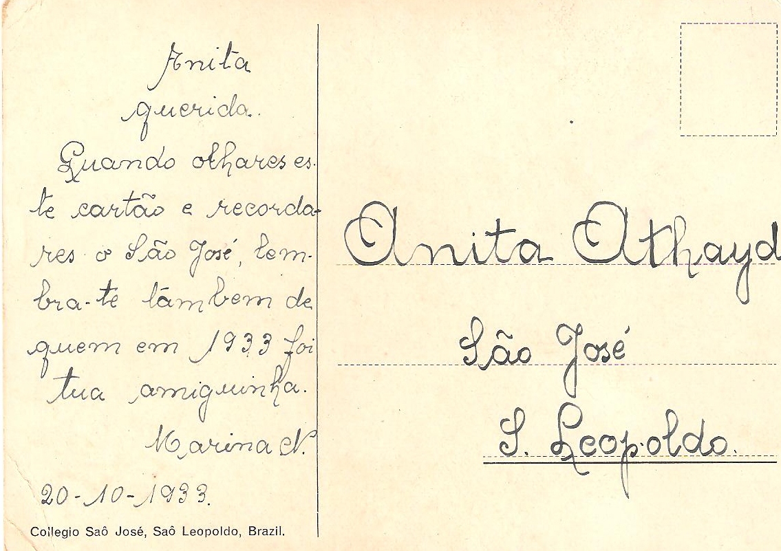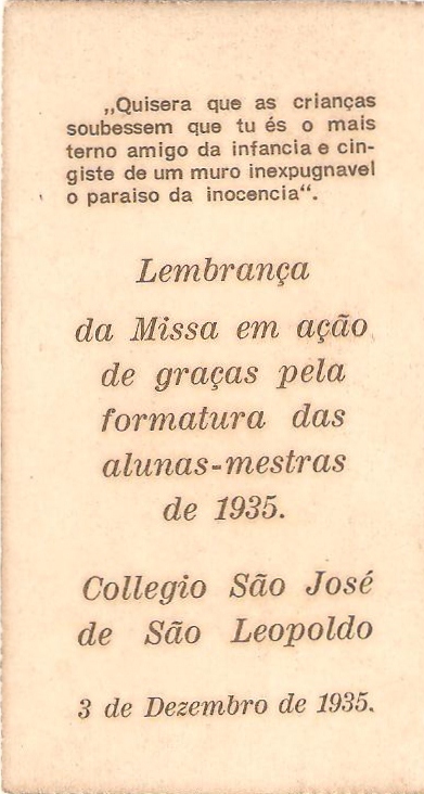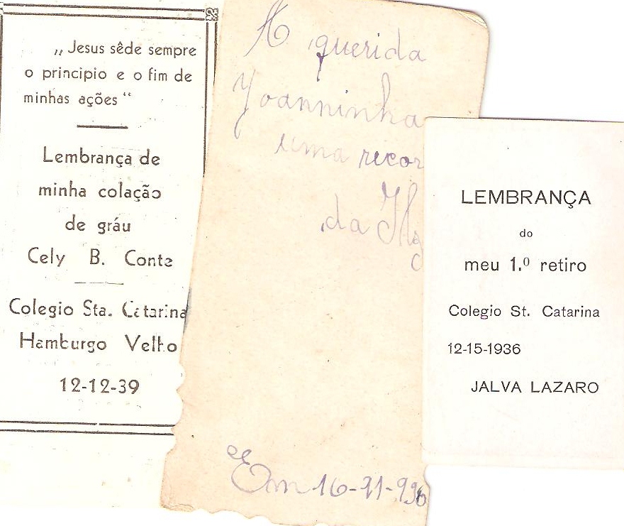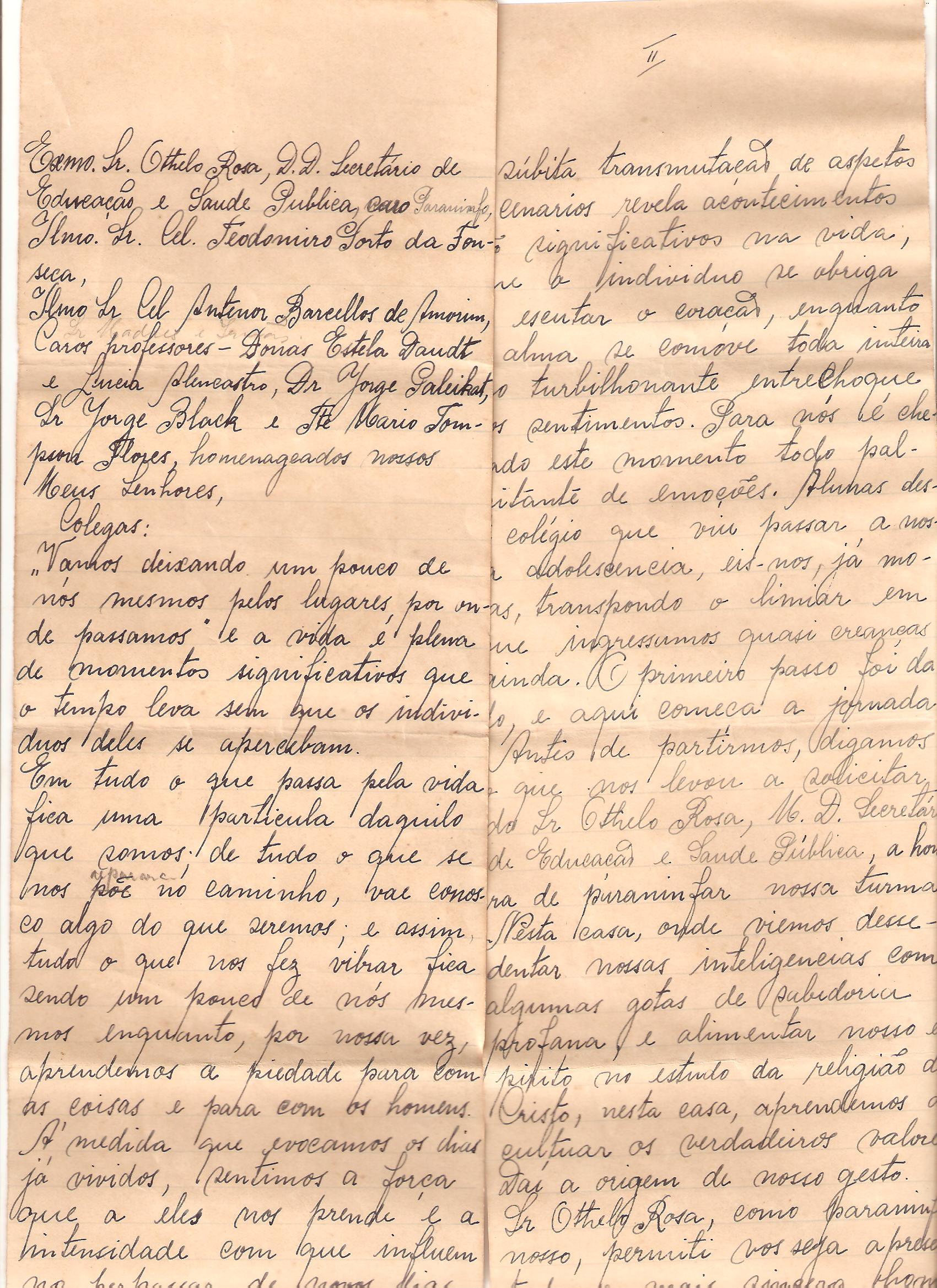 “Vamos deixando um pouco de nós mesmos pelos lugares aonde passamos e a vida é plena de momentos significativos que o tempo leva sem que os indivíduos deles se apercebam. Em tudo o que passa pela vida fica uma partícula daquilo que somos; de tudo o que se nos aparece no caminho, vai conosco algo do que seremos; e assim tudo o que nos fez vibrar fica sendo um pouco de nós mesmos enquanto, por nossa vez, aprendemos a piedade para com as coisas e para com os homens. À medida que evocamos os dias já vividos, sentimos a força que a eles nos prende e a intensidade com que influem no perpassar de novos dias. Momentos há, porém, em que a súbita transmutação de aspectos e cenários revela acontecimentos tão significativos na vida que o indivíduo se obriga a escutar o coração, enquanto a alma se comove toda inteira no turbilhonante entrechoque dos sentimentos. Para nós é chegado este momento todo palpitante de emoções. Alunas deste colégio que viu passar a nossa adolescência, eis – nos, já moças, transpondo o limiar em que ingressamos quase crianças ainda. O primeiro passo foi dado, e aqui começa a jornada. Antes de partirmos, digamos o que nos levou a solicitar do Sr. Othelo Rosa. M. D. Secretário de Educação e Saúde Pública, a honrar de paraninfar nossa turma. Nesta casa, aonde viemos dessedentar nossas inteligências com algumas gotas de sabedoria profana, e alimentar nosso espírito no estímulo da religião do Cristo, nesta casa, aprendemos a cultuar os verdadeiros valores. Daí a origem do nosso gesto. Sr. Othelo Rosa, como paraninfo nosso, permiti vos veja apresentada a mais sincera homenagem com o “obrigada’ desta turma que mereceu a partícula distinção de receber como protetor, uma das mais legítimas glórias rio-grandense, uma das figuras mais destacadas nas letras gaúchas, um dos maiores benfeitores da instrução de nosso Estado. Fale de seu valor, seu próprio nome a se impor cada vez mais como autoridade reconhecida nas questões de Ensino Sr. Othelo Rosa, as alunas mestras deste colégio, que de vossas mãos acabam de receber diploma, agradecem a gentileza com que lhes acolheste o convite, abrilhantando esta solenidade com vossa presença. (…)