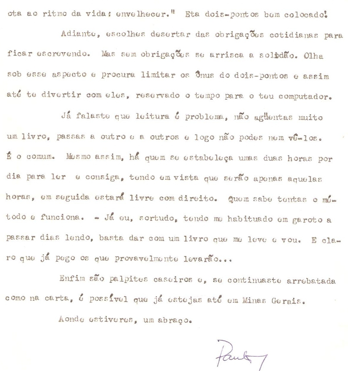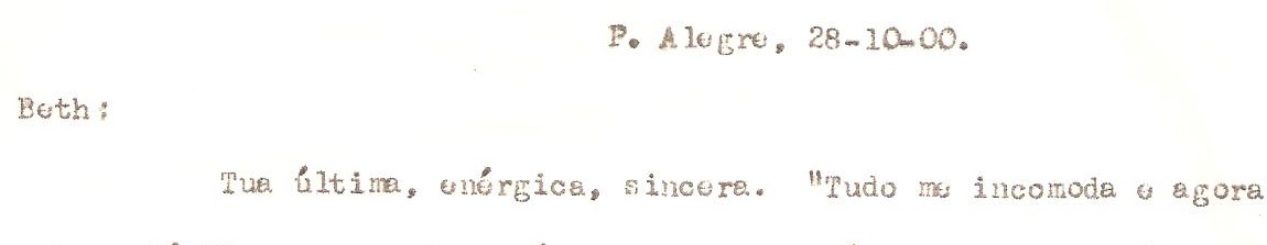 ” Perdoa, mas em verdade estou mal exatamente por não estar aí. Este ‘estar mal’, porém, deixa-me como se fosse um poste de eucalipto fixado ao solo para nada, só para apodrecer. Estou aqui literalmente de mãos amarradas: tudo que faço, quando faço, faço ml, me equivoco. Atarantado, é este o termo. Ando assim. Como o gaúcho daquele poema irônico do Asceno Ferreira: corro intrépido pelos pampas, vou, venho, sempre intrépido. Para que? Para nada. Nem sequer para estar aí…”