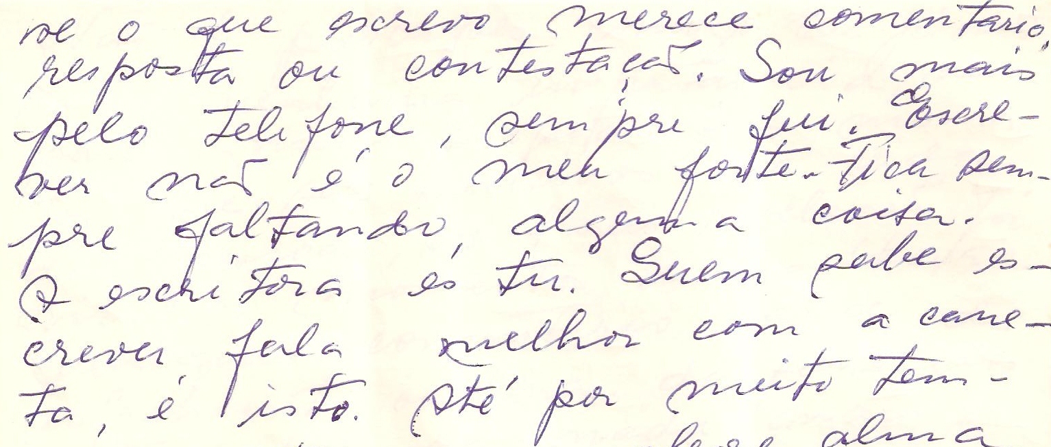 Recebi a tua carta. Vejo-te a beira do mar. Enche, pois, as tuas mãos de mar, enche os teus olhos de luz. Na minha lembrança, tu és uma presença. Eu perdi o jeito de correr pelas praias e de me misturar com os peixes. Faz isso por mim. De Torres guardo este fragmento, por certo o mais agreste, o mais autêntico. (aqui tem um desenho) Ao pé do penhasco, o mar enrola-se como uma grande cobra verde. Ao longe ele é sereno. A distância dá placidez as coisas. Tenho produzido pouco ou nada. Espero melhores dias. Mando-te a minha saudade que é muita.