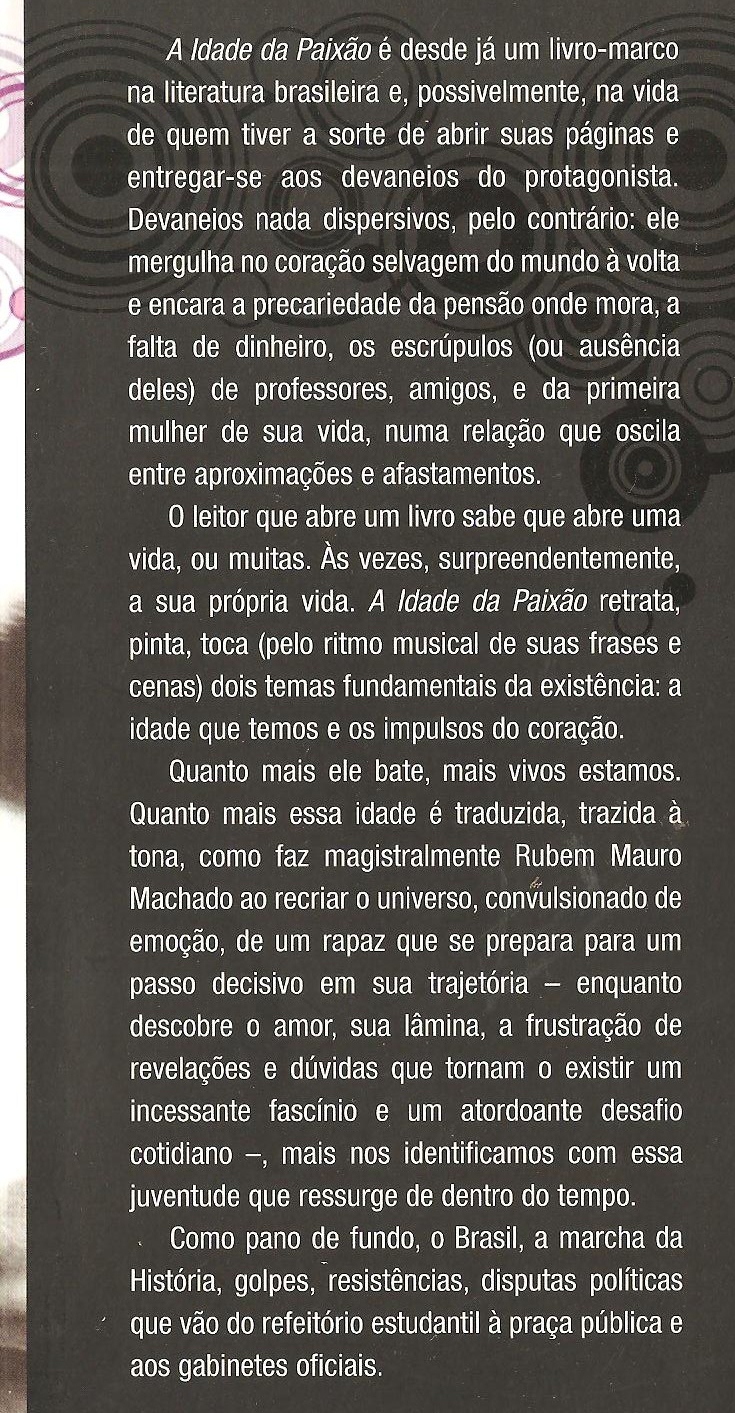 O livro ganhou o Prêmio Jabuti Melhor Romance. Merecido. Rubem Mauro Machado agarra o leitor. Edição da Bertrand Brasil 2006.