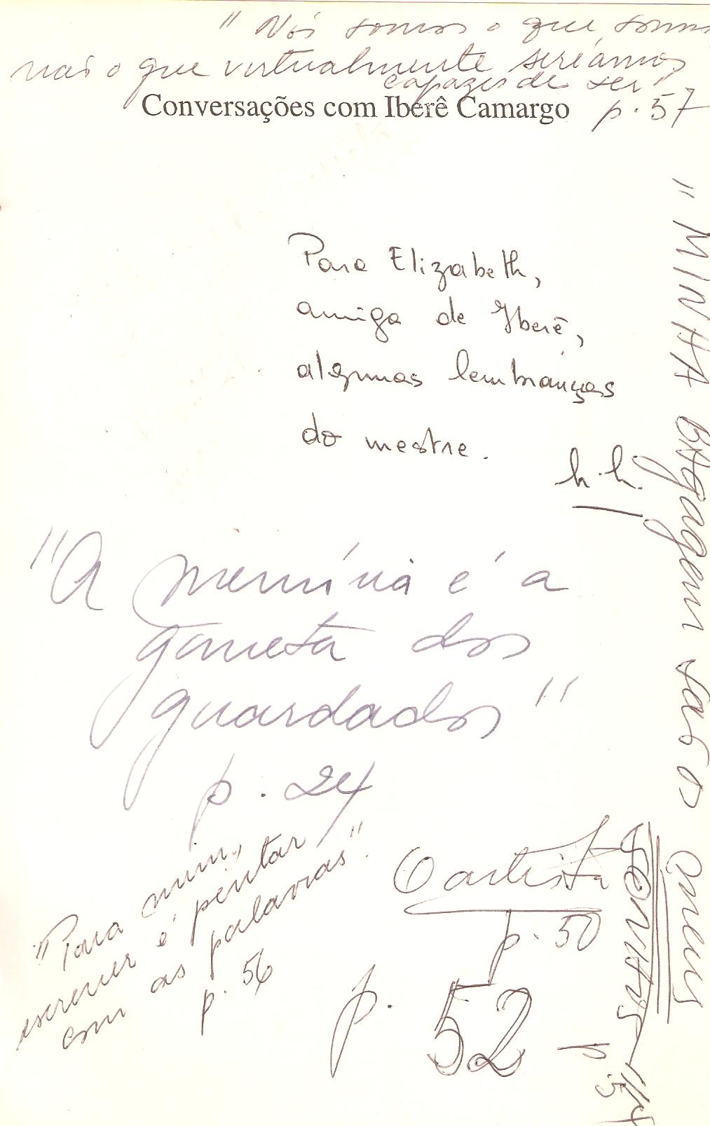“... porque no decorrer do viver eu entendo que a vida é uma caminhada. Esses ciclistas são caminhantes. No fundo, sem meta. São seres desnorteados. No andar do tempo, vão ficando as lembranças; os guardados vão se acomodando em nossas gavetas interiores. Inicialmente, engraçado, as coisas que doem ficam mais. Como temos cicatrizes! A vida foi causando essas feridas que nos acompanham até o fim. Nós somos como uma tartaruga, nós carregamos a casa. Essa casa são as lembranças. Nós não poderíamos testemunhar o hoje se nós não tivéssemos por dentro o ontem, porque nós seríamos uns tolos a olhar as coisas como recém-nascidos, como sacos vazios. Nós só podemos ver as coisas com mais clareza e mais nitidez porque temos um passado, compreende? Ele vem se colocar, ajudar a ver e a compreender o momento que estamos vivendo.” (p.30-31) Conversações com Iberê Camargo – Lisette Lagnado.