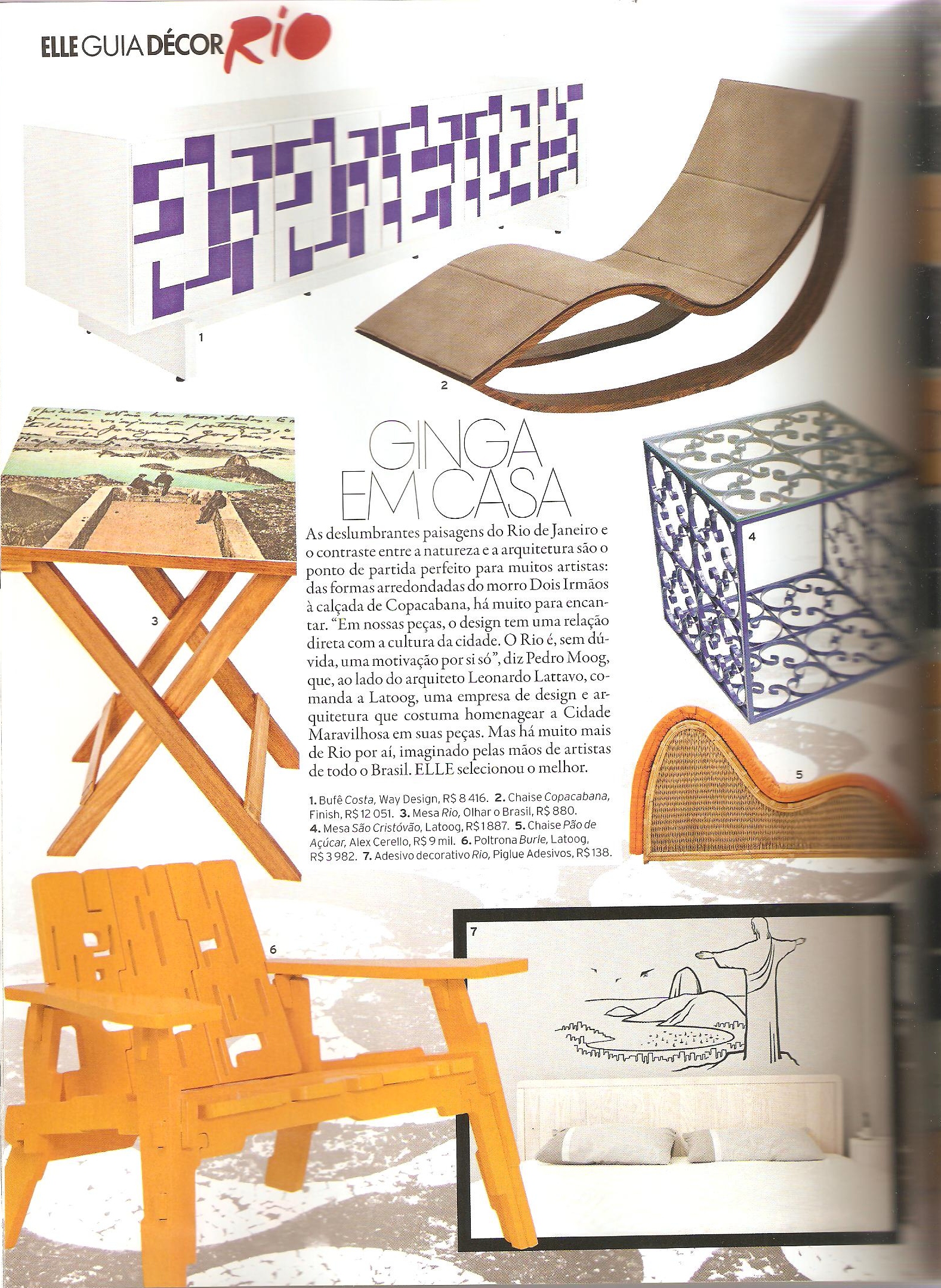As deslumbrantes paisagens do Rio de Janeiro e contraste entre a natureza e a arquitetura são o ponto de partida perfeito do morro Dois Irmãos à calçada de Copacabana, há muito para encantar. Em nossas peças, o desing tem uma relação direta com a cultura da cidade. “O Rio é, sem dúvida, uma motivação por si só”, diz Pedro Moog, que ao lado do arquiteto Leonardo Lattavo, comanda a LATTOOG, uma empresa de desing e arquitetura que costuma homenagear a Cidade Maravilhosa com suas peças. Mas há muito mais de Rio por aí, imaginado pelas mãos de artistas de todo o Brasil. Elle selecionou o melhor.