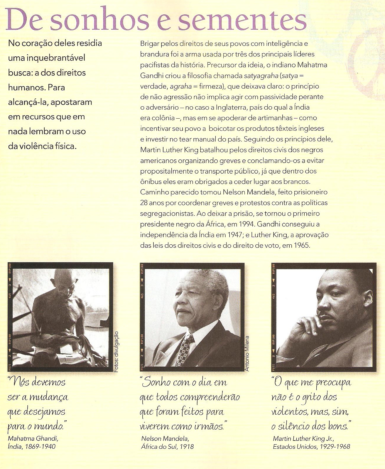 Brigar pelos diretos de seus povos com inteligência e brandura foi uma arma usada por três dos principais líderes pacifistas da história. Precursor da ideia, o indiano Mahatma Gandhi criou a filosofia chamada satyagraha (satya= verdade), ágrafa= firmeza), que deixava claro: o princípio de não agressão não implica agir passividade perante o adversário – no caso da Inglaterra, país da qual a Índia era colônia-, mas em se apoderar de artimanhas – como incentivar seu povo a boicotar os produtos têxteis ingleses e investir no tear manual do país. Martin Luther King batalhou pelos direitos civis dos negros americanos organizando greves e conclamando-os a evitar propositadamente o transporte público, já que dentro dos ônibus eram obrigados a ceder lugar aos brancos. Caminho parecido tomou Nelson Mandela, feito prisioneiro 28 anos por coordenar greves e protestos contra políticas segregacionistas. Ao deixar a prisão, se tornou o primeiro presidente negro da África, em 1994. Ghandi conseguiu a independência da Índia em 1947; e Luther King, a aprovação dos direitos civis e do direito de voto, em 1965.