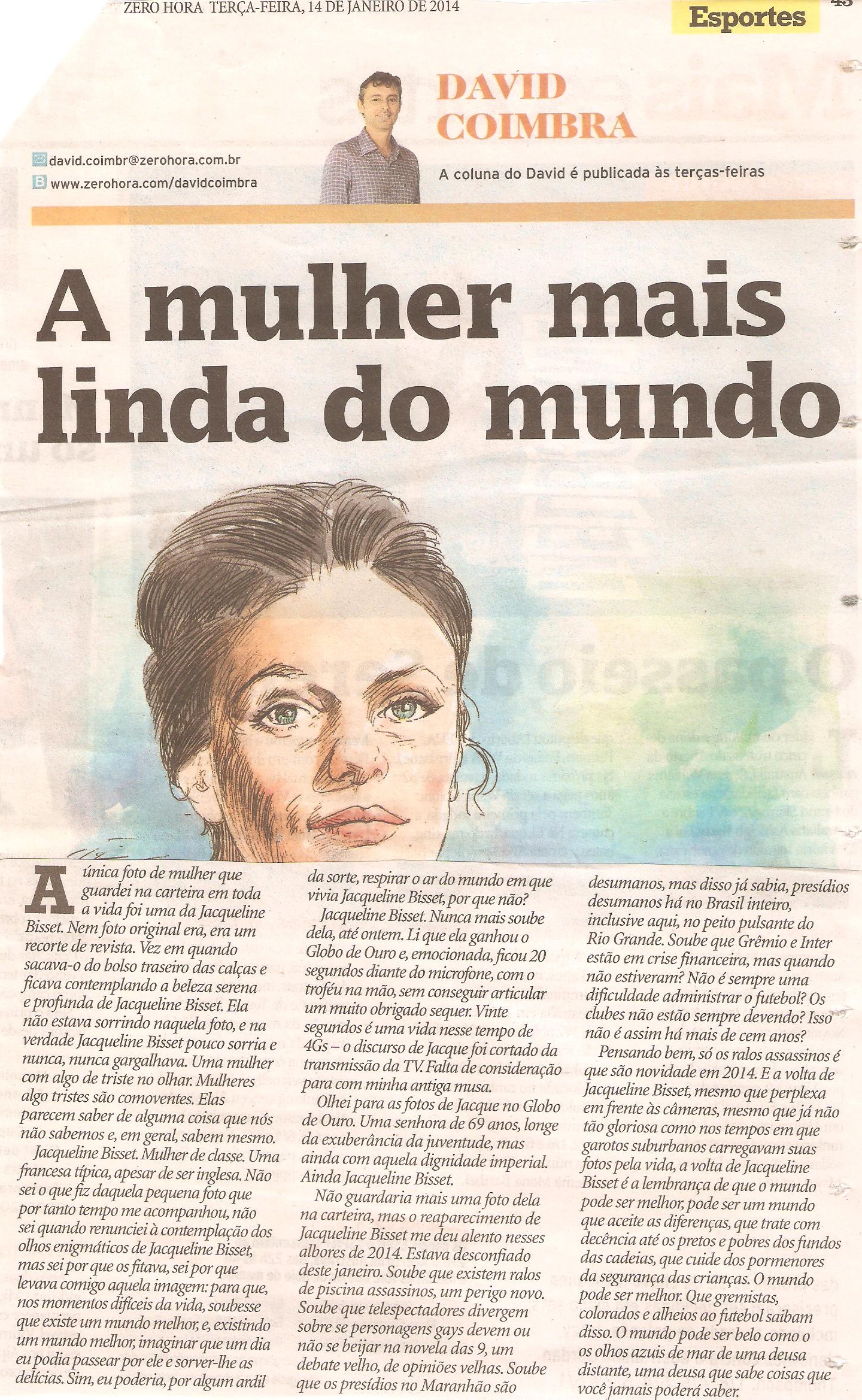 A notícia é de ontem, 14 de janeiro. Entre poucas notícias, o bom com David Coimbra. Bom escritor, bom jornalista, jovem, e atento. Inspira bons sentimentos. Arranca do matagal, deste amontoado de horrores, uma margarida para fotografar. Gosto do que pensa quando escreve. “Pensando bem, só os ralos assassinos é que são novidade em 2014. E a volta de Jacqueline Bisset, mesmo que perplexa em frente às câmaras, mesmo que já não tão gloriosa como nos tempos em que garotos suburbanos carregavam suas fotos pela vida, a volta de Jaqueline Bisset é a lembrança de que o mundo pode ser melhor, pode ser um mundo que aceite as diferenças, que trate com descência os pretos, os pobres dos fundos de cadeia, que cuide dos pormenores da segurança das crianças. O mundo pode ser melhor.[…] O mundo pode ser belo como os olhos azuis de mar de uma deusa distante, uma deusa que pode coisas que você jamais poderá saber.”(Zero Hora,p 43 Esportes. 14 de janeiro de 2014