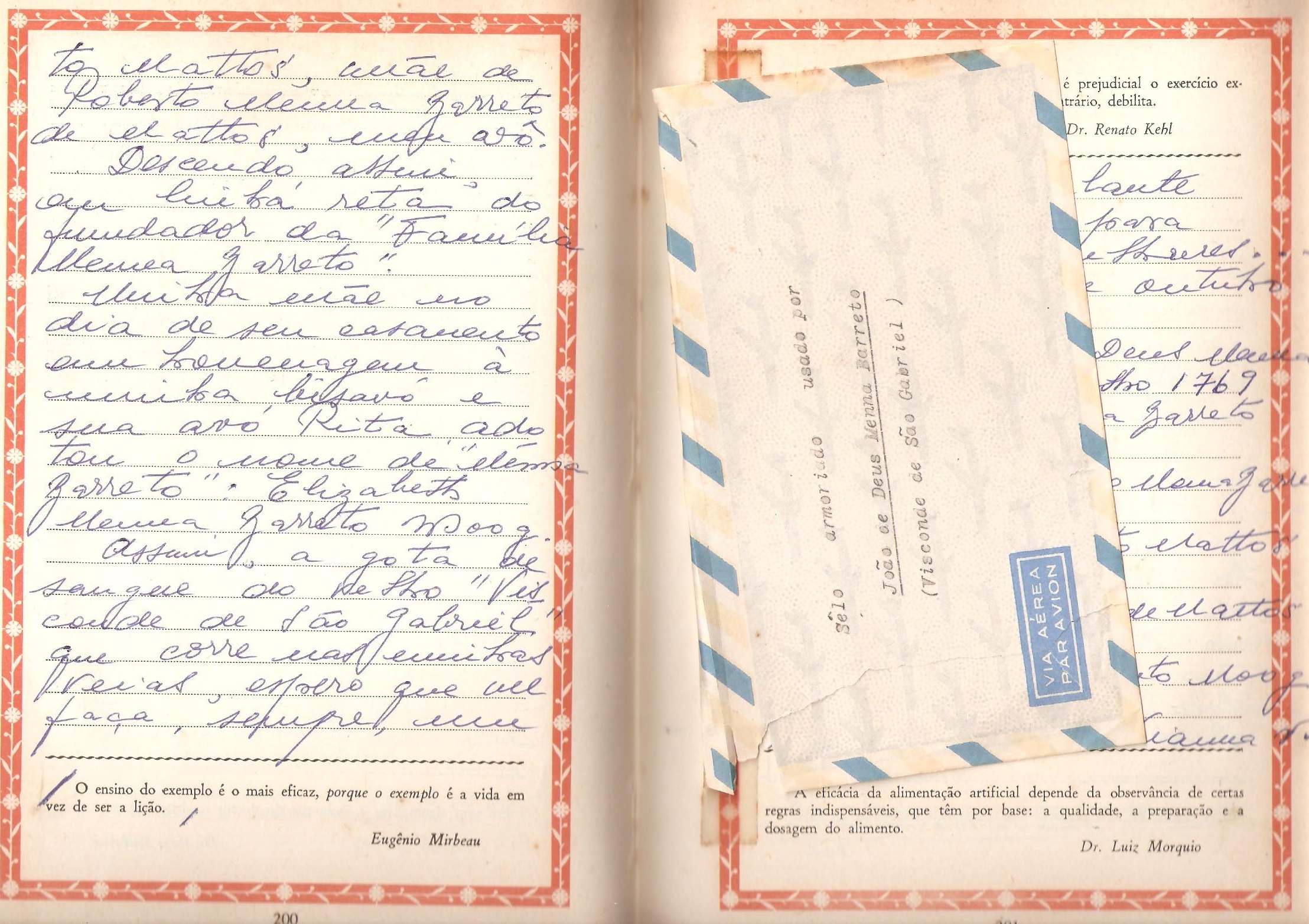 João de Deus Barreto Pereira Pinto, filho de nobre estirpe portuguesa, em homenagem à mulher com quem casava adota o nome de João de Deus Menna Barreto. Galanteio dos Menna Barreto com suas mulheres… ao longo de sua vida mereceu pelos serviços prestados à Pátria o título de Visconde de São Gabriel. Nasceu em Rio Pardo, a 2 de julho de 1769. Seu filho primogênito foi o Marechal Gaspar Menna Barreto, pai de Firmino Herculano Menna Barreto, pai de Rita Menna Barreto Mattos, mãe de Roberto Menna Barreto Mattos, avô de Pedro Menna Barreto Vianna Moog. Roberto escreve pelo neto, no livro: “Descendo assim, em linha reta, do fundador da Família Menna Barreto. Minha mãe, no dia do seu casamento, em homenagem à minha bisavó, e sua avó Rita, adotou o nome de Menna Barreto. Elizabeth Menna Barreto Moog. Assim, a gota de sangue do velho Visconde de São Gabriel que corre nas minhas veias, espero me faça, sempre, homem “galante e cavalheiro” para com as mulheres…Rio, 18 de outubro de 1973.