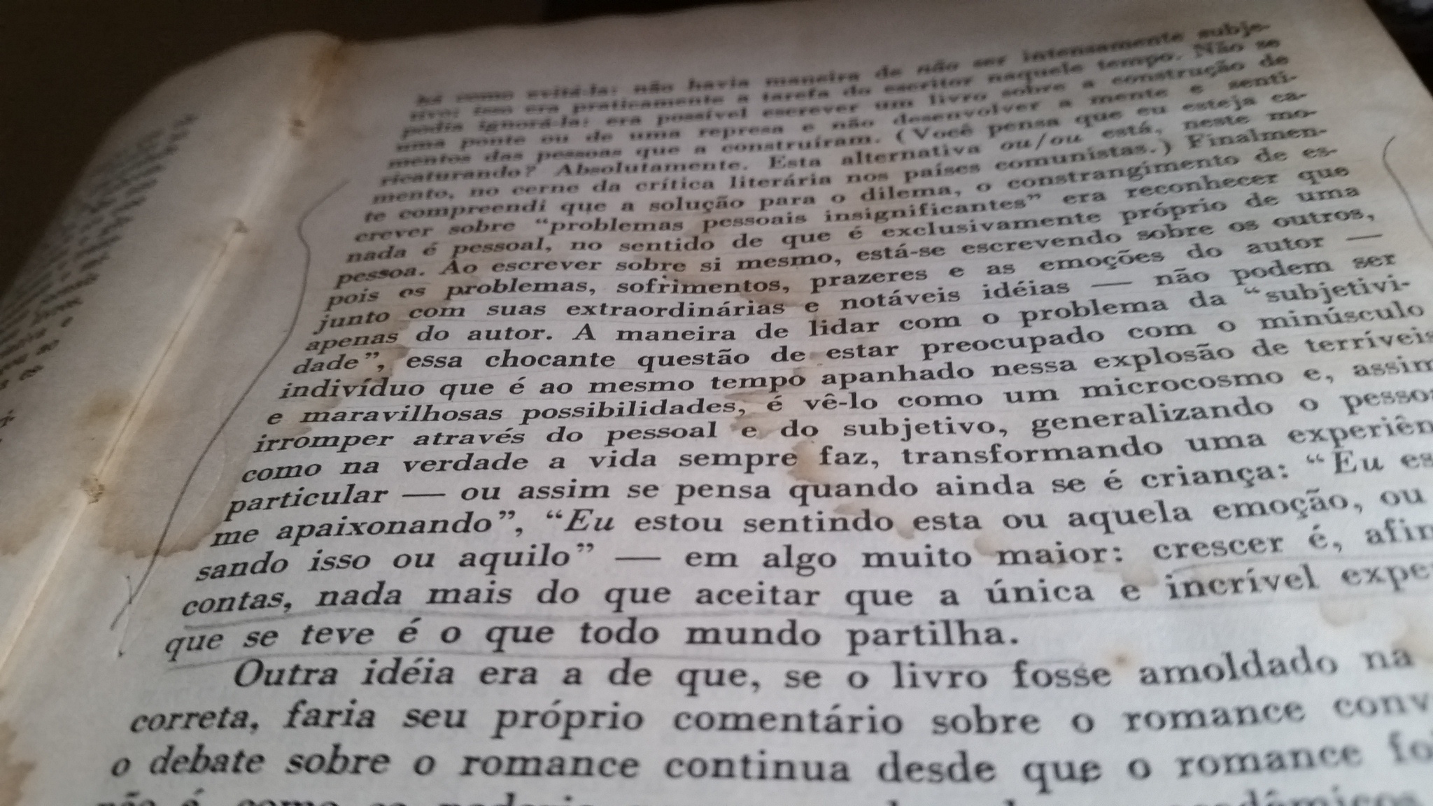 “Finalmente compreendi que a solução para o dilema, o constrangimento de escrever sobre ‘problemas pessoais insignificantes’ era reconhecer que nada é pessoal, no sentido de que é exclusivamente próprio de uma pessoa. Ao escrever sobre si mesmo, está-se escrevendo sobre os outros, pois os problemas, sofrimentos, prazeres e as emoções do autor – junto com suas extraordinárias e notáveis ideias – não podem ser apenas do autor. A maneira de lidar com o problema da ‘subjetividade’, essa chocante questão de estar preocupado com o minúsculo indivíduo que é ao mesmo tempo apanhado nessa explosão de terríveis e maravilhosas possibilidades, é vê-lo como um microcosmo e, assim, irromper através do pessoal e do subjetivo, generalizando o pessoal, como na verdade a vida sempre faz, transformando uma experiência particular – ou assim se pensa quando ainda se é criança: ‘Eu estou me apaixonando’, Eu estou sentindo esta ou aquela emoção, ou pensando isso ou aquilo ‘ ‘- em algo muito maior: crescer é, afinal de contas, nada mais do que aceitar que a única e incrível experiência que se teve é o que todo mundo partilha.” (p.13) O Carnê Dourado, Doris Lessing. Editora Record. RJ. 1972.