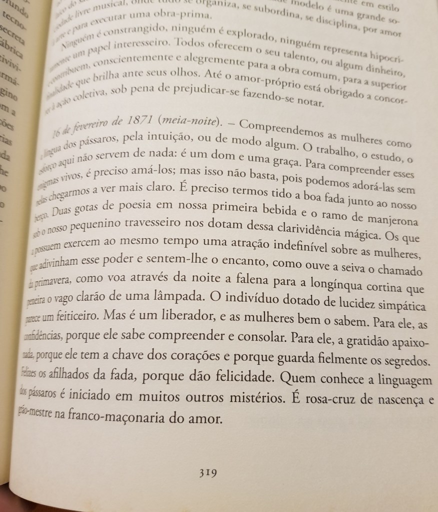 16 de fevereiro de 1871 (meia-noite) Compreendemos as mulheres como a língua dos pássaros, pela intuição, ou de modo algum. O trabalho, o estudo, o esforço aqui não servem de nada: é um dom ou uma graça. Para compreender estes enigmas vivos, é preciso amá-los; mas isso não basta, pois podemos adorá-las sem nelas chegarmos a ver mais claro. […] O indivíduo de lucidez parece um feiticeiro. Mas é um libertador, e as mulher bem o sabem. Para ele, as confidências, porque ele sabe compreender e consolar. Para ele, a gratidão apaixonada, porque ele tem a chave dos corações e porque guarda fielmente os segredos. Felizes e afilhados da fada, porque dão felicidade. Quem conhece a linguagem dos pássaros é iniciado em muitos outros mistérios. É rosa-cruz de nascença e grão-mestre na franco-maçonaria do amor.” (p.319)Henri-Frédéric Amiel Diário Íntimo