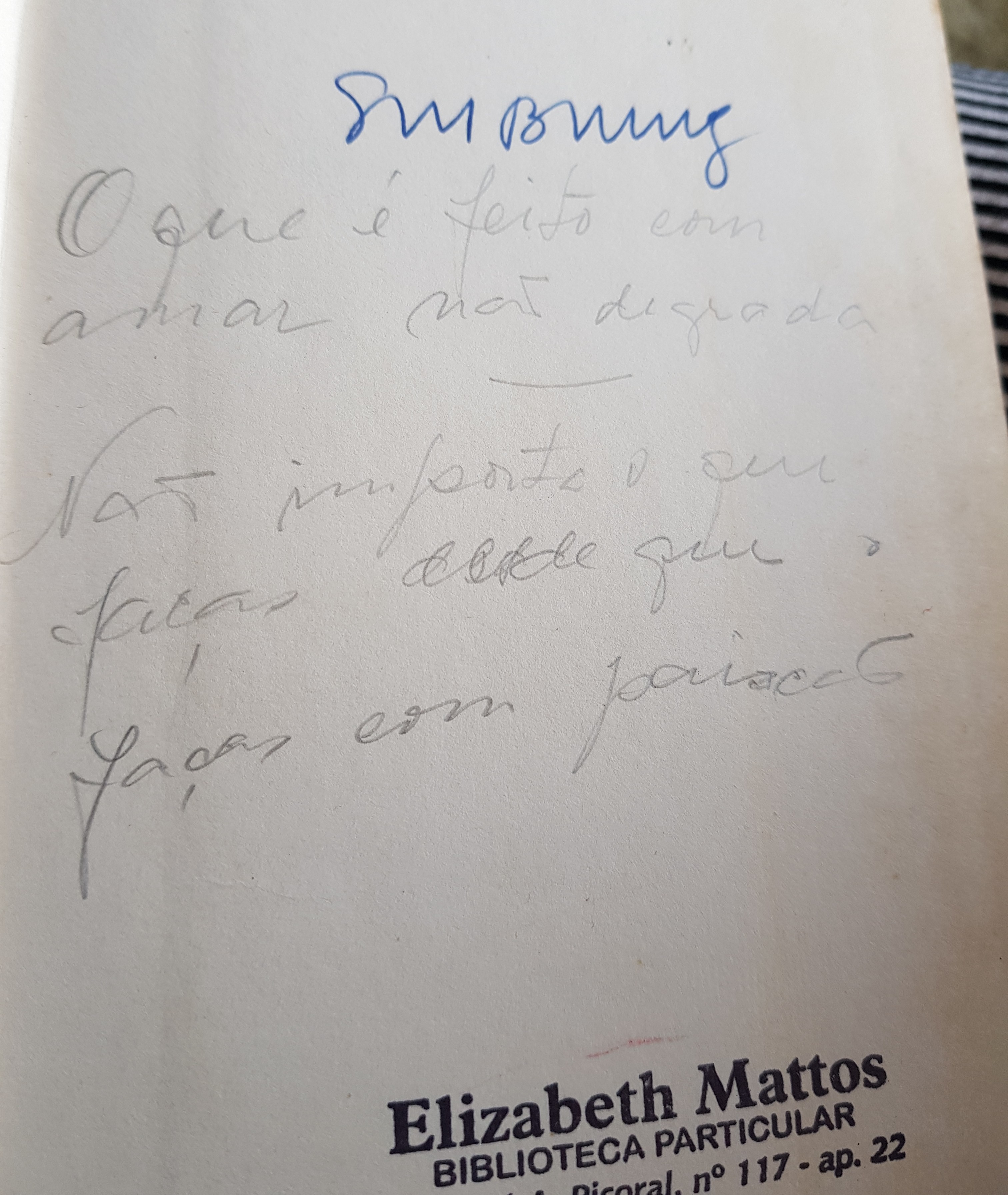 primavera 15/11/202015/11/2020 / amorasazuis primavera: coceira pelo corpo palavra e letra de texto imperfeito lento, manso, e também furioso. vento desta/nesta primavera chuva e sol: desânimo enfiado no domingo. Beth Mattos Compartilhe isso: Clique para compartilhar no X(abre em nova janela) 18+ Clique para compartilhar no Facebook(abre em nova janela) Facebook Curtir Carregando... Relacionado