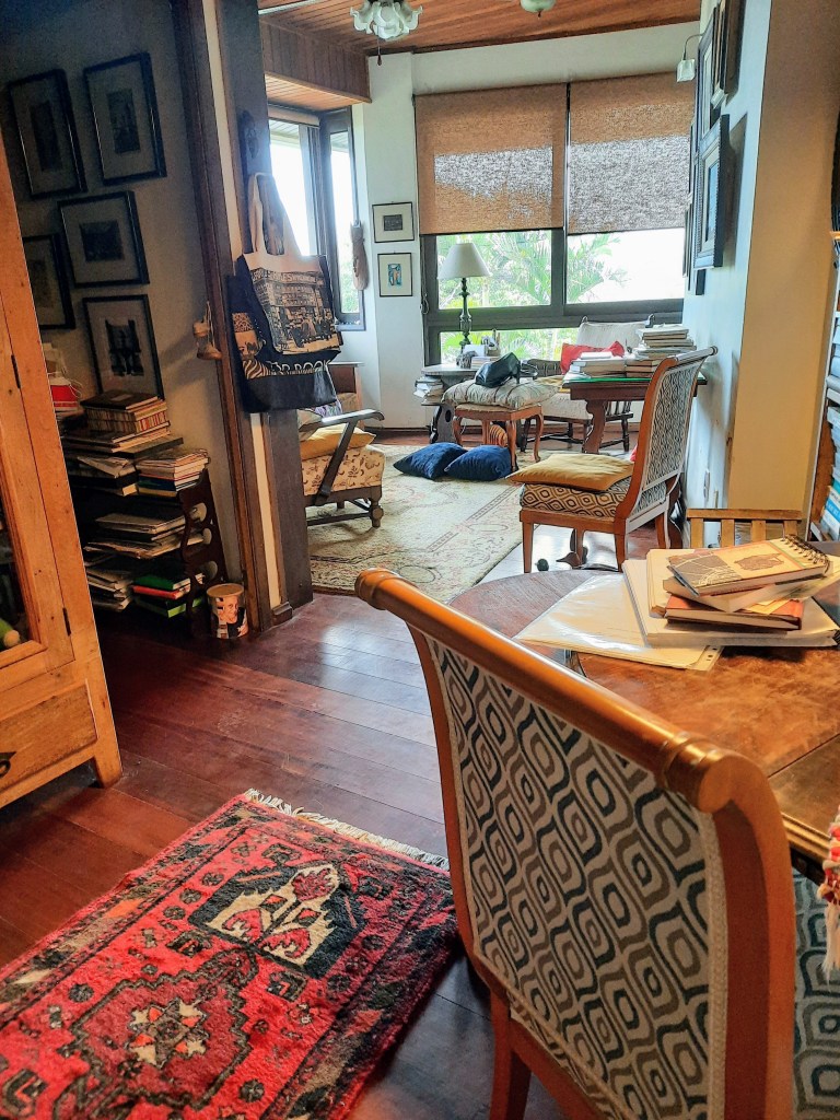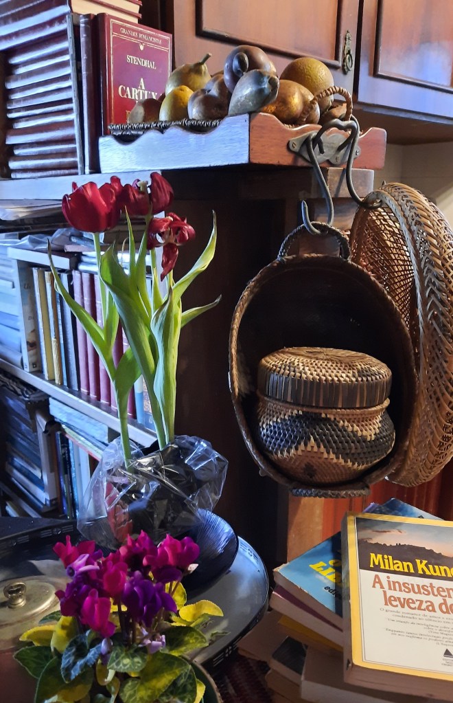 22 de abril de 2021 – dia de sol, bonito, bonito demais. Ontem terminei a arrumação da cômoda e das estantes onde estão (o presente não se fez passado, permanência dos danados: os cupins)… Tempo perdido, guerra perdida, paliativo: os pozinhos voltam/voltaram, voltarão… Toda a manhã em função da faxina dos vidros, faz a diferença, muda o cheiro. Depois, dormi um pouco, o corpo doí. Tirei a mesa preta (está na garagem), o apartamento aumenta, móveis pesados, grandes. Espaço, no meio da casa, alecrim dourado. Ainda estou cansada. Escrever me animaria, não. Vou caminhar um pouco com a Ônix. Com ela/para ela foi um dia corrido (as faxinas são sempre novo jogo de esconde-esconde), e de estranheza.