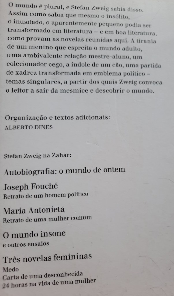 “Estão, constantemente, à espera, sempre prontos e determinados a seguir o rastro de uma aventura até a beira do abismo. Estão sempre carregados de paixão, mas não a do amante, e sim a do frio, calculista e perigoso jogador. Entre eles, há os persistentes, para os quais, desde a juventude e por toda a vida, essa expectativa torna-se uma aventura eterna; para os quais cada dia se dissolve em uma centena de pequenas experiências sensuais – um olhar de passagem, um meio sorriso discreto, rápido e silencioso, um roçar acidental de joelhos – e cada ano em centenas desses dias; para os quais a experiência sensorial constitui a fonte que flui eternamente, nutrindo e aquecendo suas vidas.” (p.13) Stefan Zweig Novelas insólitas