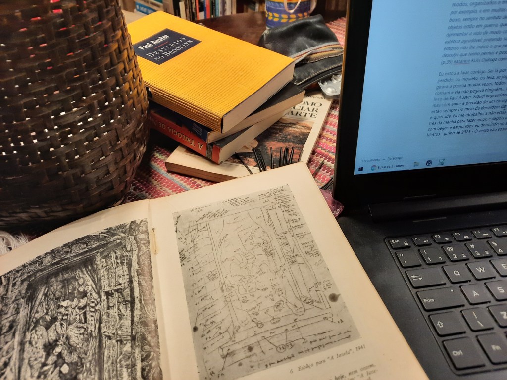 Eu estou a falar contigo. Sei lá por onde andas, ou se andas com tuas pernas, ou se te moves na cama, ou se estás perdido, ou inquieto, ou feliz. Estou a falar contigo enquanto jogas /brincas de cabra-cega -, fazíamos quando criança, vendava-se os olhos, girava-se a pessoa sobre ela mesma muitas vezes, todos corriam, e ela tinha que pegar alguém, e todos riam, zoavam, se aproximavam, corriam e ela tateava no ar… lembras? Vou assistir um pouco de televisão, quem sabe um filme, ou terminar o livro de Paul Auster. Já te disse o tanto que me impressiona a narrativa. Descreve minuciosamente a mãe, sem escorregar, sem piedade, mas com cuidado e precisão de cirurgião. Algumas pessoas são apressadas para amar porque temem a solidão. (Estou assim desconcentrada, perdoa) Afoitas, sempre no meio da desordem da vida, e sofrem. Também eu não sei o que devo saber para ser sossego e quietude. Eu me atrapalho. Eu te amo agora sem te ver / eu imagino o amor de amar. E não estás aqui para me explicar… Eu aprenderia? Entenderia? Ou apenas te divertes quando me acordas às três da manhã para fazer /dizer/apalpar e rir do amor, e depois desmaiares, voares para teu quarto pé ante pé. Beijos e empurrões, sussurros e apertos. Eu dormindo no sonho de te querer penso que és tu para ficar… Ah! O delírio. Elizabeth M.B. Mattos – junho de 2021 – O vento não sossegou, vou tentar dormir outra vez. Por favor, chega logo. Prometo não te segurar, e te deixar partir para voltares…