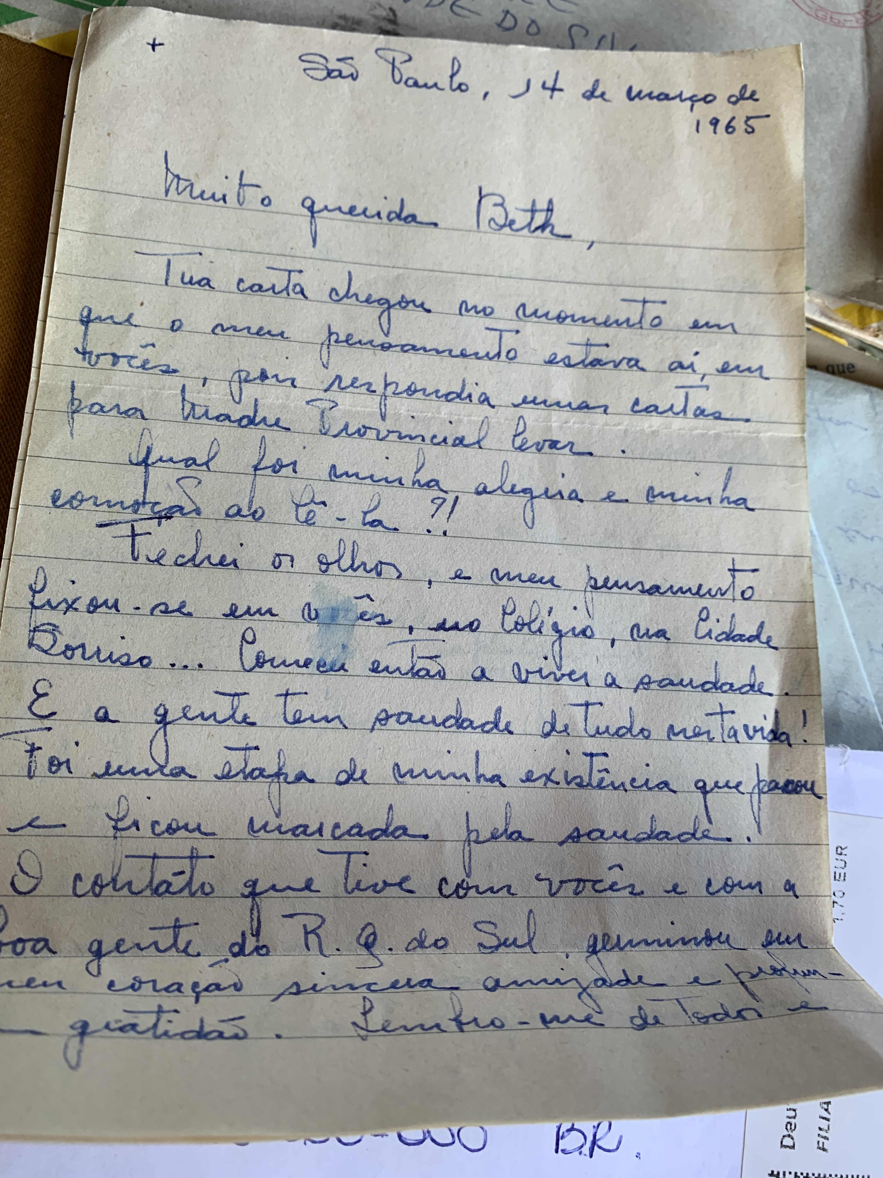 …intenso. E as Madres agostinianas importaram: amigas, correspondentes. Cartas pontuam a vida: Madre Maris Stella, Madre Paulina, Madre Hermínia… E o tempo enrola tudo. A correspondência encerra, no papel, mundos entrelaçados, esquisitices e tanta amorosidade…