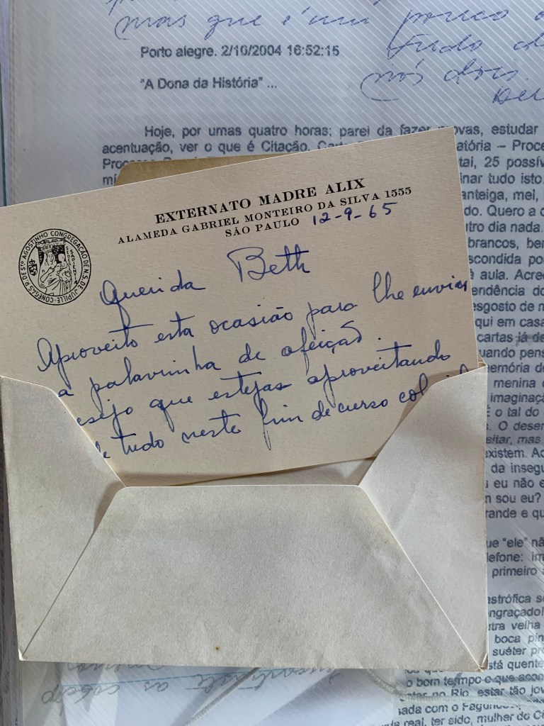 Ventania, calor, depois tanto frio! Ideias habilidosamente coladas, como velhos jarros… Estou a desabafar, perdoa. Um STOP às cartas. Sem sentimento, ou amorosamente, não sei. Em todo caso afetuosamente, eu te mando jasmins com hortênsias e margaridas. Elizabeth M.B. Mattos – julho de 2021 – Torres – revirando as cartas de tantos anos, tanta adolescência e escolha estranhada, tantos caminhos! Beth M.B. Mattos – julho de 2021 – Torres / organizando as caixas