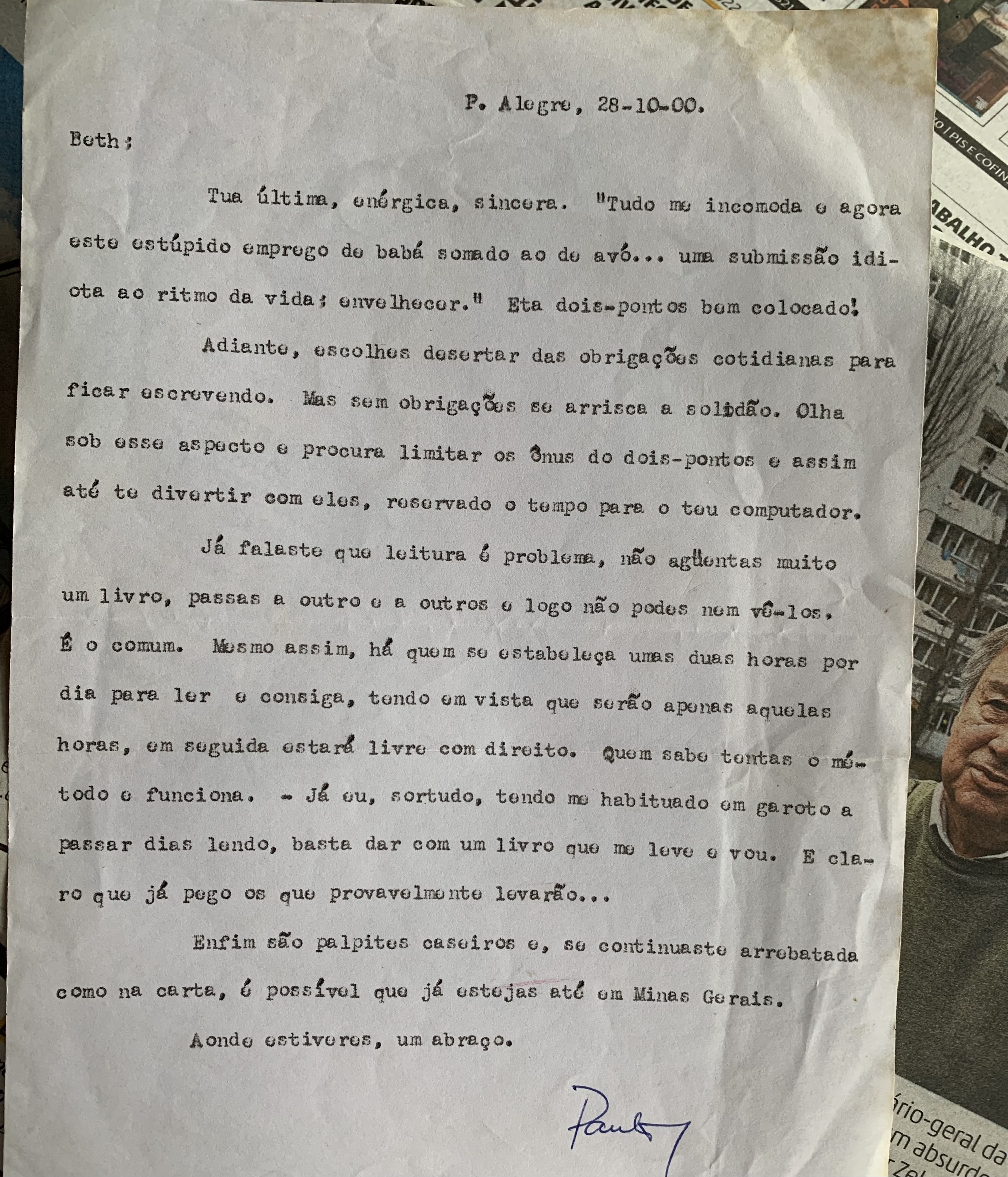 As minhas cartas / longas, queixosas sempre a dizer tudo e mais um pouco eram respondidas com a paciência de sempre e me abraçavam ! Eu refletia! Afinal, apreendi a ler com cuidado, senão cuidado, prazer, prazer, prazer a loucura! E escrever?! Sigo a teclear / também alucinar nos escritos. Elizabeth M.B. Mattos – abril de 2022