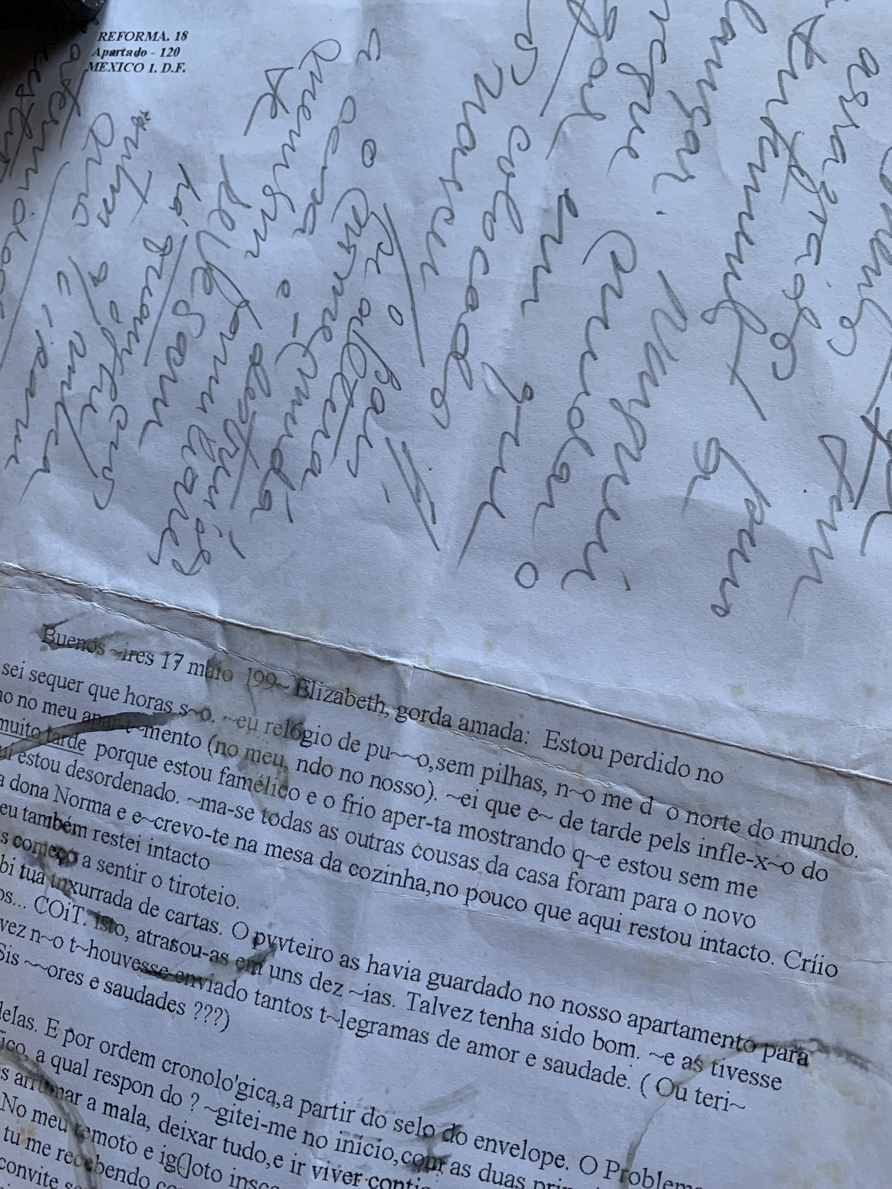 “Buenos Aires, 17 de maio 199 Elizabeth, gorda amada: Estou perdido no mundo. Não sei sequer que horas são, meu relógio de pulso, sem pilhas, nome do norte do mundo. Estou sozinho no meu apartamento (no meu, não no nosso), sei que é tarde pela inflexão do sol. E que é muito tarde porque estou famélico e o frio aperta mostrando que estou sem me alimentar. Aqui estou desordenado. […] todas as outras cousas da casa foram para o novo apartamento da dona N. e escrevo-te na mesa da cozinha, no pouco que aqui restou intacto. Creio – creio – que eu também restei intacto.