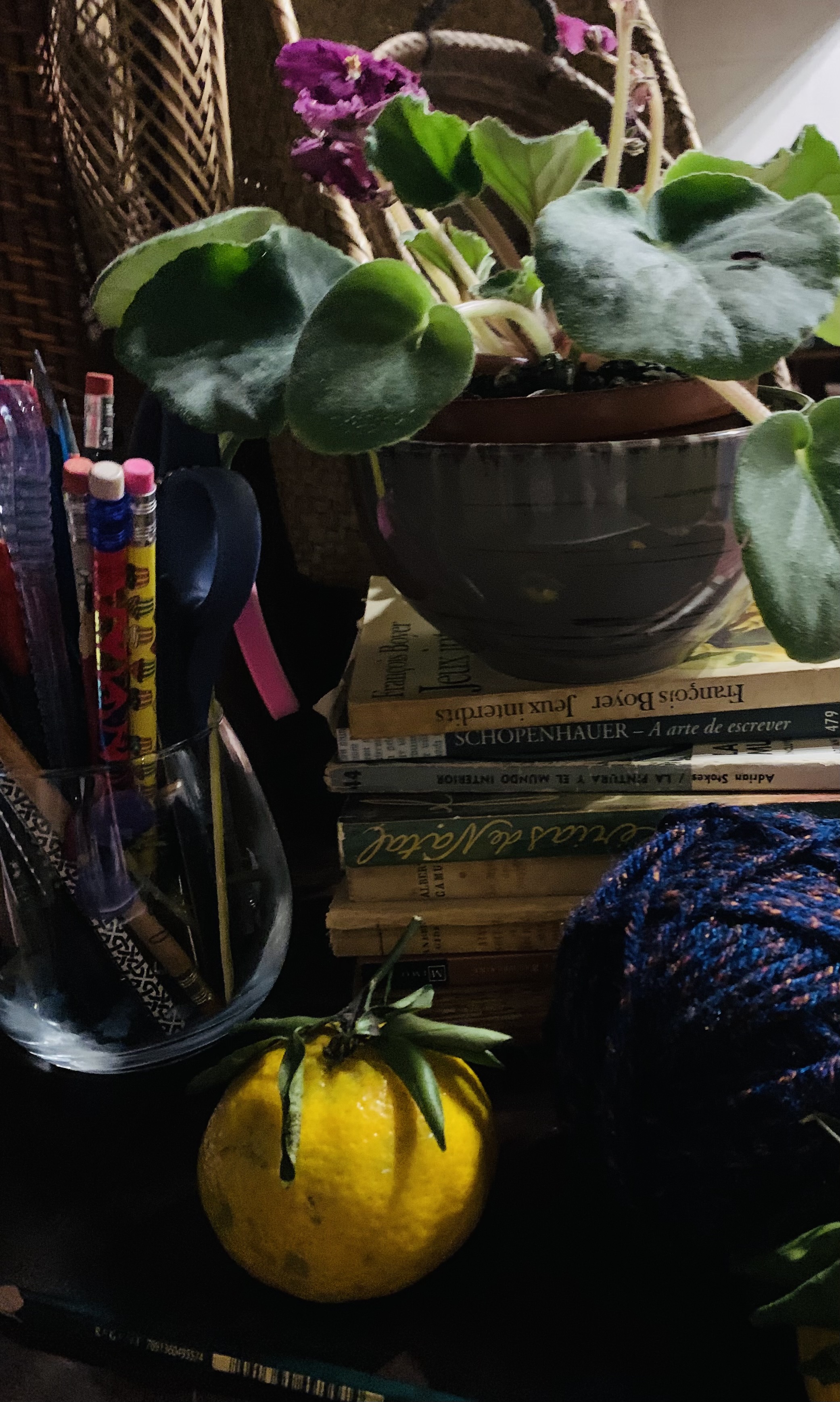 Uma repassada pelas cartas, as escritas e as pensadas. Uma memória gelada num maio frio, a preguiça esquisita do tempo passando, tempo desanimado, impreciso, sem motivo. Escuto o som dos relógios, a música interrompida, o rádio não funciona. Tanta coisa não funciona! E deixa-se ficar no canto. Poderia ser tudo diferente. Eu quis assim, difícil. Batalha e guerra, e luta todos os dias. Por que a gente deseja o avesso do que está sendo ofertado? Tendo pensar como eu poderia me descrever pra me encontrar, por que escrever e não viver? Aonde estão escondidos os bailes, maravilhosos!? A renda, o cetim e o natural. Por que o mais difícil, o intrincado, depois de me deliciar no linho, nos bordados, escolher o perfeito do vestido, a bainha impecável? O que aconteceu? Que frio! Comidinhas no forno! E o vinho! Que delícia! Descobrindo os prazeres todos os dias! Fotografei! Não resisti, as bergamotas também, o feijão também! Pronto! desabafei! Elizabeth M.B. Mattos – junho de 2022 – Torres – bem cinzento por aqui!