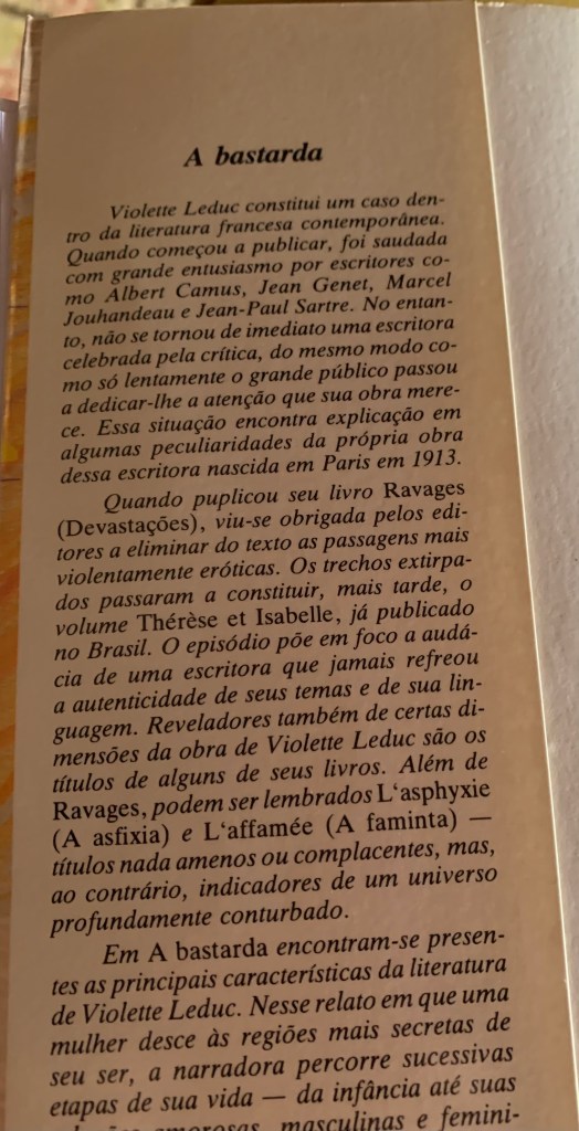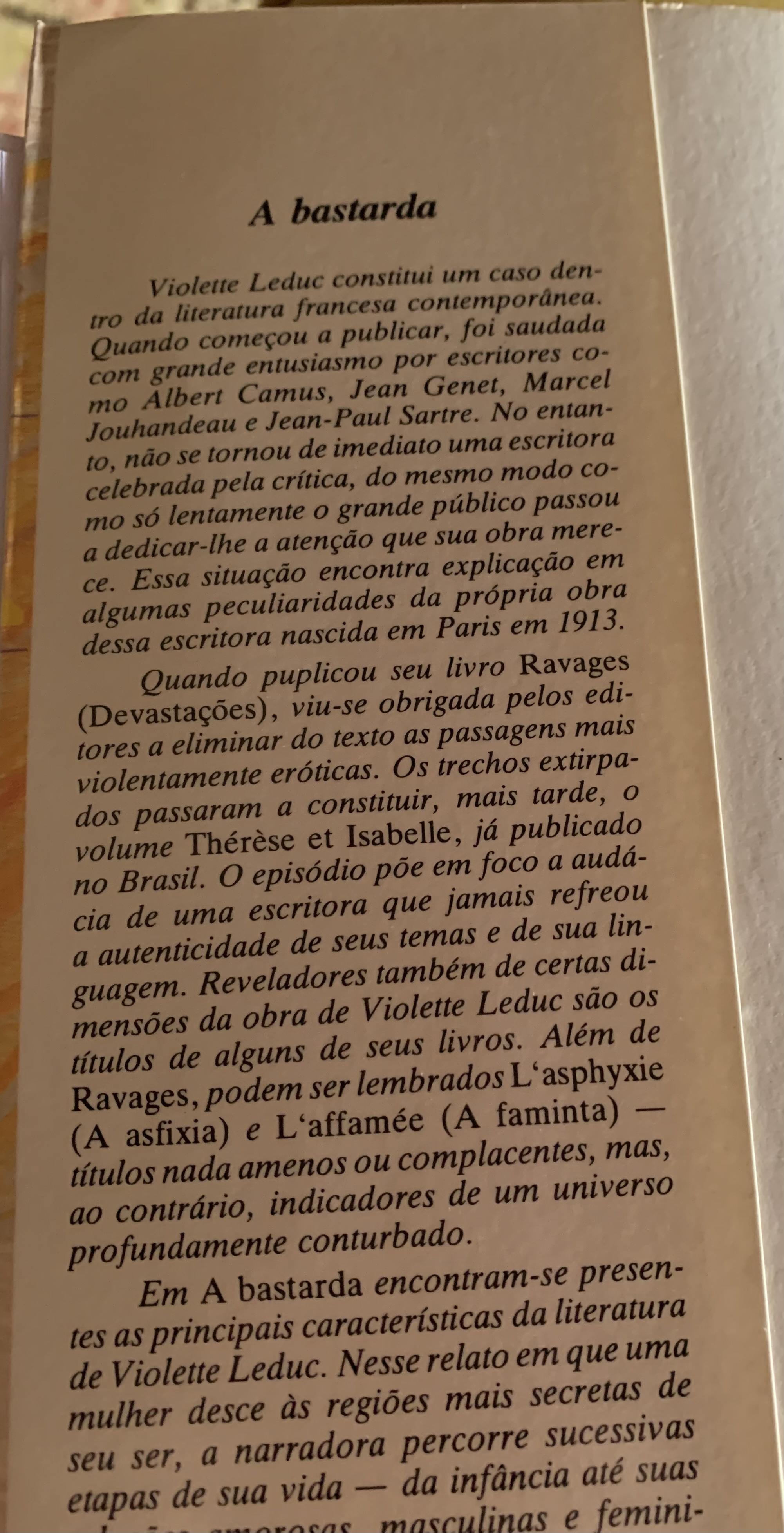 Leituras do acaso, da procura. Abrir um livro comprado há tempo, tanto tempo! (1986)… e ir, voltar, encontrar. Quantos anos?! De lá pra cá nas mudanças e ir, voltar, encontrar… Sem encontro, sem o clic. Decido me desfazer, o tal desapego necessário para deixar mais leve, leve?! E se eu voar / desaparecer em tanta leveza?! Pois é, o humor pesado, certos agravos, certo…? Nem sei bem o que estou escrevendo. Volto ao tema, um livro ao acaso, e, uma súbita intimidade, ao acaso, como aqueles amores que inflam arebatam! E, e, depois nos perguntamos, mas, como foi mesmo que aconteceu?! E por que se perdeu? Penso, penso em Paulo Sérgio, refaço a história que é toda, inteira, pontuada de altos momentos, todos altos, espaçosos e lindos… Como desaparecemos de repente?! As histórias. Mas, voltando ao livro da Violette Leduc – A Bastarda (La batârde), apenas este, peguei, então comecei a ler, e não gostei. Já ando cheia de pruridos para as leituras, aquela história de tempo…, mas o prefácio é de Simone de Beauvoir!Houve um tempo que eu lia muito e muito porque algum lugar era o fim, lia no ônibus, na praia, de madrugada, de manhã bem cedo, eu lia. Fazia tudo correndo para ter tempo de ler / de escrever qualquer coisa…E agora? E agora que não preciso correr, nem tenho tanto para fazer, nem para falar (moro sozinha), ou… E agora? Por que os livros me enjoam? Não “me agarram” como antes? Se não são os meus eternos queridinhos, que releio, que volto, que transpiro pra continuar, e outros importantes, amontoados na cabeceira como o do Robert Musil.., também largo, amuada. Tramas, histórias, descrições não me interessam, ler por ler para ler, aonde está esta ElizaBeth? Por que perdi o gosto? Abro ao acaso e começo a ler (p.273 -274) e estou lá.