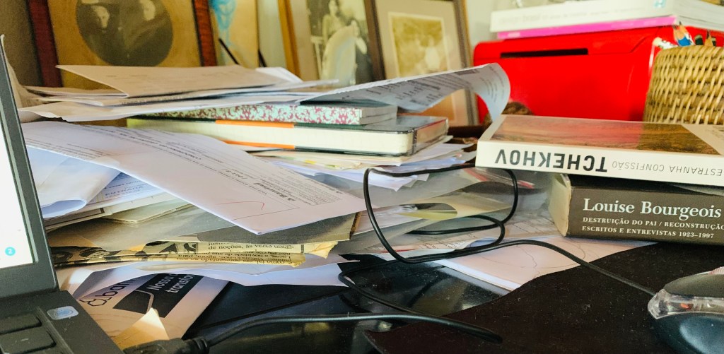 Sentimentos opostos que se agarram a mesma pessoa / contraditórios. Sonhos intensos / campo aberto, florido, tépido e fantástico mundo onírico. Uma mistura de hoje e ‘pensação’ e amanhã projetado…esquisitices, eu querendo me hospedar no colégio, e a bolsa, uma desordem de papéis / coisas / uma tal confusão sem chaves, mas o bom humor daquela sensação ao, liberta. De verdade, o livro está preso / amarrado na hora… Se esconde / se manifesta na ocasião / no minuto do momento encanto do dia. Não é determinado livro, não sou eu, nem a voz da leitura, mas a magia. Tem um piano que não aprendi a tocar, um violão escondido, e ficou o ferro de passar, e um prazer esquisito que se mistura com o cheiro da roupa limpa… e escondidas esquisitices. Elizabeth M. B. Mattos – junho de 2023 – Torres