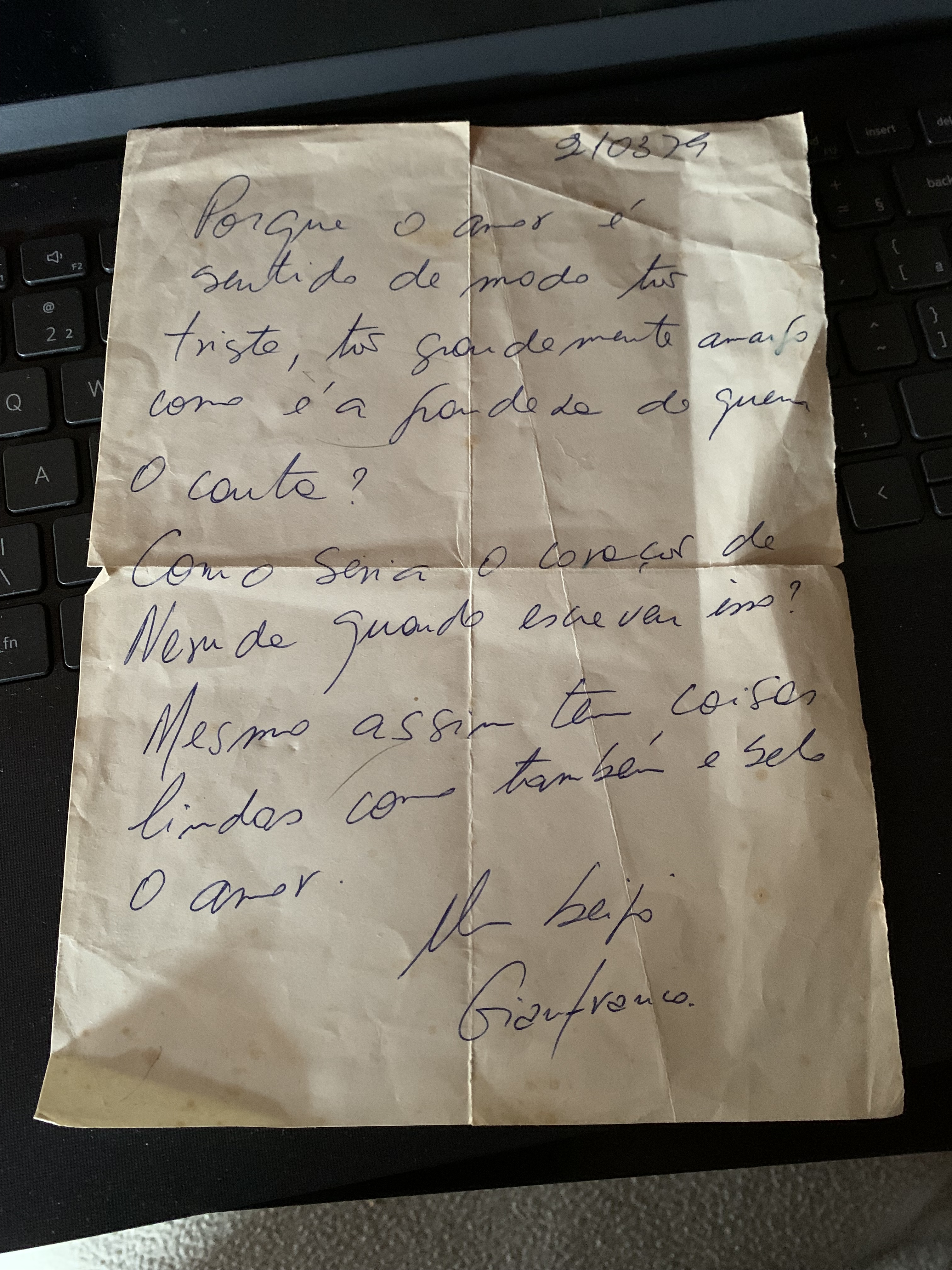 Palavras do/de amor: amantes, estranhamentos, voltas e encontros que nos envolvem… Espicaçados se colam, e volta o sentimento. Escritos imaginados, fugacidade surpreendida. Existiu? A beleza da autora da biografia de Marguerite Duras – colas permanentes da vida. Elizabeth M.B. Mattos – novembro de 2023 – Torres