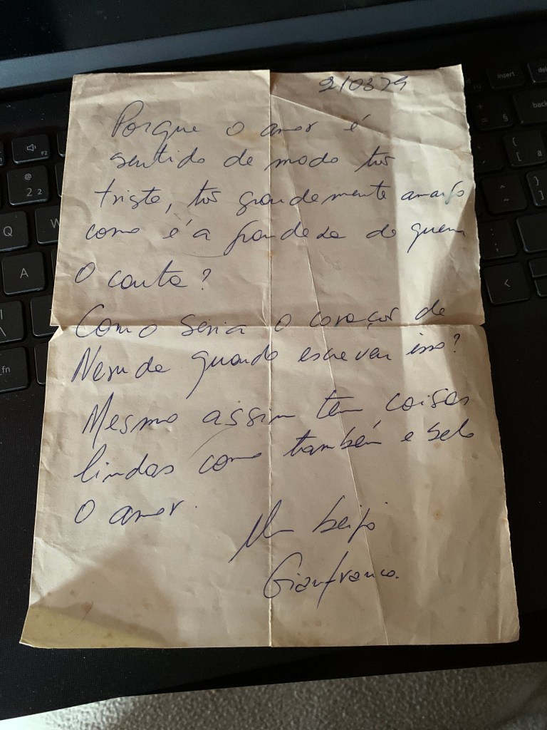 As pequenas e silenciosas frases apagadas nas dobras das cartas, explicam o inexplicável, o desconhecido. A isso chamamos de histórias de terror. Vomitar não resolve a doença, não cura, por um momento dá um certo alívio e sono. Estas pequenas e grandes insônias que se transformam em prazer… Depois, eu posso escrever. Depois do sono. Elizabeth M. B. Mattos – novembro de 2023 – Torres
