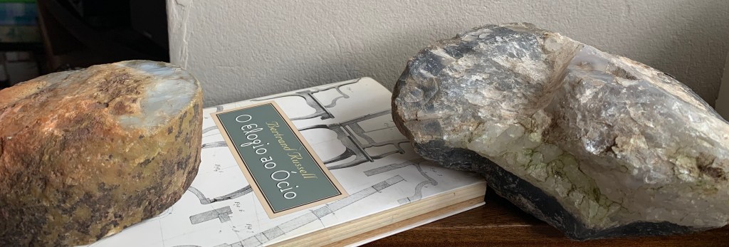 Estou limpando, tirando o cheiro da poeira do pó. E engrossa nas estantes o odor. Deteriora os livros. Exagera em ficar, poderia ser mais rápida a visita… Encontro o que esqueci no meio do empilhado de ‘faço amanhã’. Encontro Bertrand Russel com outras pedras. Vender, comprar.