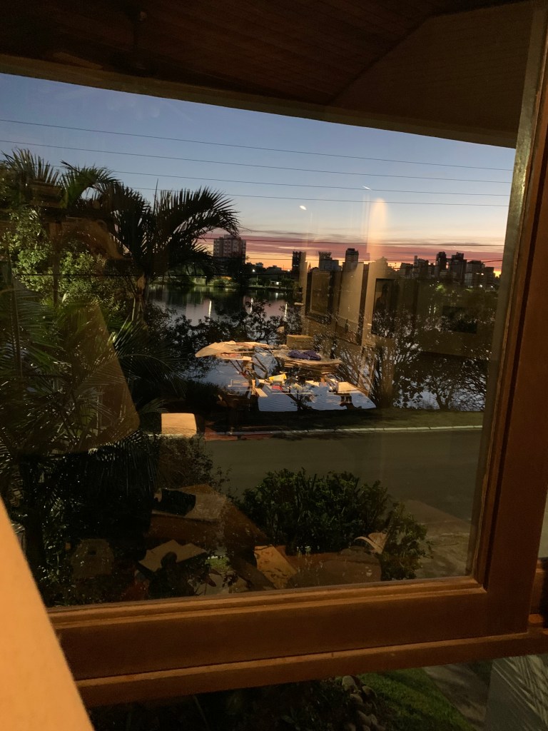 Para reentrar minha mãe percorro os mesmos corredores. Vejo os seus olhos claros, arregalados, generosos. Os olhos do meu pai. Os dela eram pequenos castanhos, inquietos. Lindo ele. Apenas carinho e encontro. Para chegar perto de minha mãe eu bebo uma xícara de café preto e fumo um cigarro. E ela sorri. Ou bebo um gole d’água gelada, ou água com limão, o pai recomendava. Acompanho a leitura em voz alta que ela faz para ele. Comentam o parágrafo, eu não entendo, apenas ouço. Antes das refeições estamos todos ali, reunidos. A tia Joana senta no sofá. Eu como as bergamotas descascadas com os dedos: sentada nos degraus do alpendre: o sol entrando… Os nós de pinho queimam na lareira porque é inverno. Estamos na biblioteca da rua Vitor Hugo, 229. Apenas eu sentada nos degraus do alpendre. Elizabeth M. B. Mattos – junho de 2024 – Torres – com o sol a entrar no apartamento – a ideia de morar em Torres, meus filhos e eu deve ter sido, mesmo, do meu pai. O apartamento da rua José Picoral, 117 – foi comprado para ser meu. Coisas de saber o futuro, no presente, no agora das pessoas.
