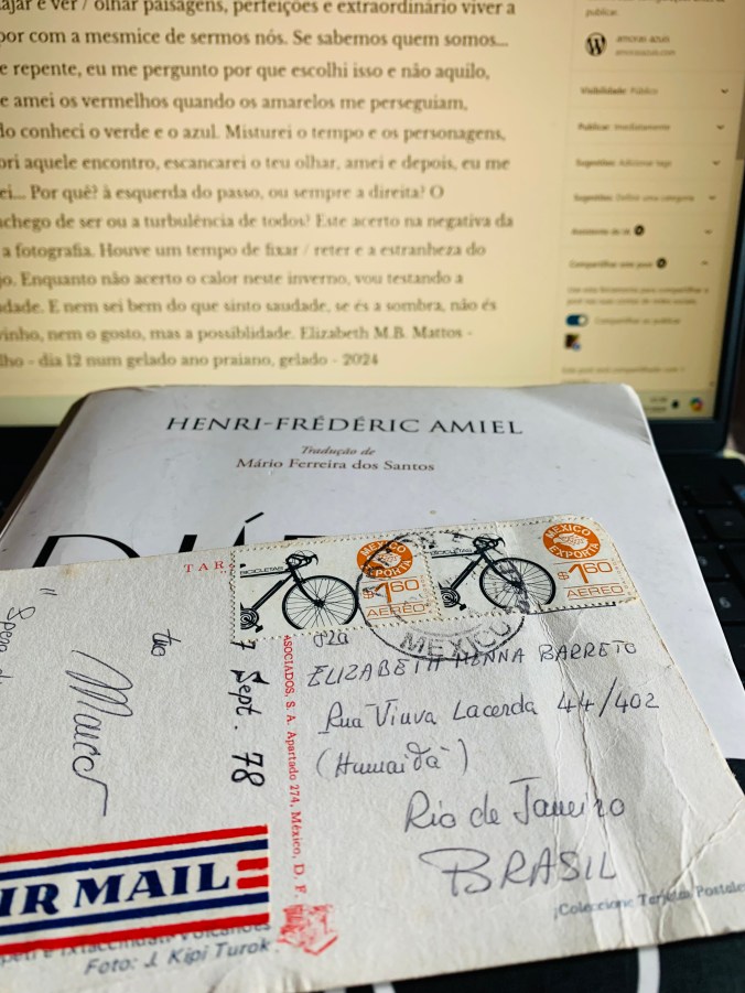a gente não conta nada de novo, todos tivemos / tiveram o primeiro amante, lágrimas compulsivas. o estado catatônico de não saber o que fazer: nem sexo, nem falar, nem pensar, mas poder correr correr, e correr e chegar em casa, bufando suando e feliz. liberto, apaixonado pelo primeiro amor. e depois quantos foram os anos sem amor entre lágrima, queixa, paciência, tolerância e espera. ah! esta vida de surpresas… estes amores comprimidos numa memória de lacunas. no meio da dança, dos ritmos do tempo certo. volta o gosto e a saudade. Eu? eu estou lá entre passado e futuro, caminhando e correndo. cansada, dolorida e feliz. Elizabeth M. B. Mattos – agosto de 2025 – Torres – Torres outra vez como ponto final, ou começo?